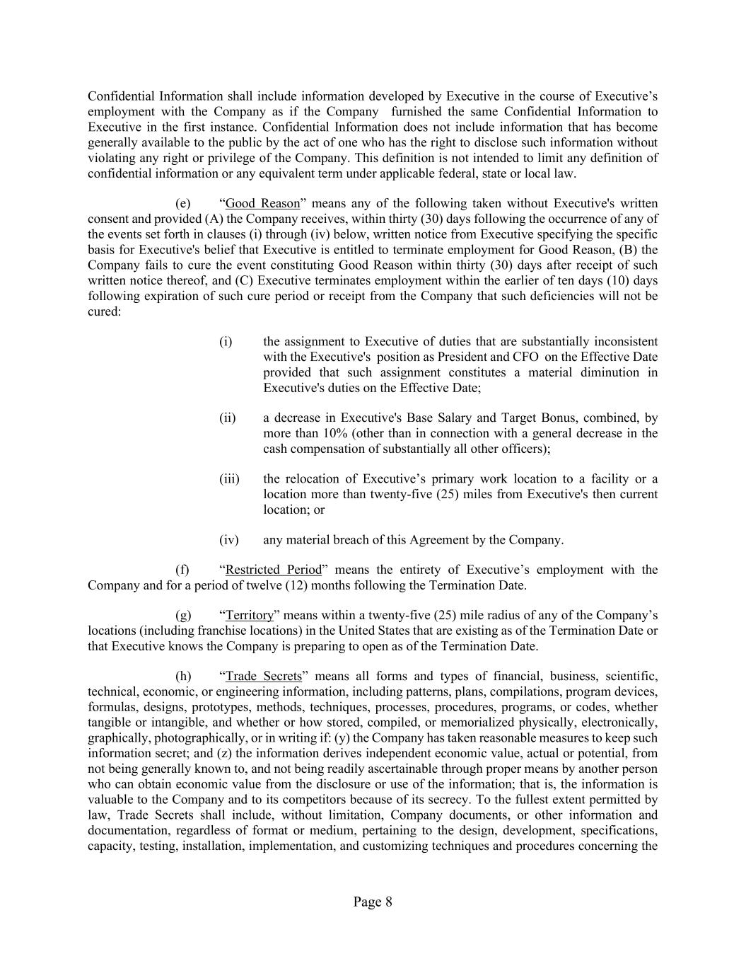 Page 8 Confidential Information shall include information developed by Executive in the course of Executive’s employment with the Company as if the Company furnished the same Confidential Information to Executive in the first instance. Confidential Information does not include information that has become generally available to the public by the act of one who has the right to disclose such information without violating any right or privilege of the Company. This definition is not intended to limit any definition of confidential information or any equivalent term under applicable federal, state or local law. (e) “Good Reason” means any of the following taken without Executive's written consent and provided (A) the Company receives, within thirty (30) days following the occurrence of any of the events set forth in clauses (i) through (iv) below, written notice from Executive specifying the specific basis for Executive's belief that Executive is entitled to terminate employment for Good Reason, (B) the Company fails to cure the event constituting Good Reason within thirty (30) days after receipt of such written notice thereof, and (C) Executive terminates employment within the earlier of ten days (10) days following expiration of such cure period or receipt from the Company that such deficiencies will not be cured: (i) the assignment to Executive of duties that are substantially inconsistent with the Executive's position as President and CFO on the Effective Date provided that such assignment constitutes a material diminution in Executive's duties on the Effective Date; (ii) a decrease in Executive's Base Salary and Target Bonus, combined, by more than 10% (other than in connection with a general decrease in the cash compensation of substantially all other officers); (iii) the relocation of Executive’s primary work location to a facility or a location more than twenty-five (25) miles from Executive's then current location; or (iv) any material breach of this Agreement by the Company. (f) “Restricted Period” means the entirety of Executive’s employment with the Company and for a period of twelve (12) months following the Termination Date. (g) “Territory” means within a twenty-five (25) mile radius of any of the Company’s locations (including franchise locations) in the United States that are existing as of the Termination Date or that Executive knows the Company is preparing to open as of the Termination Date. (h) “Trade Secrets” means all forms and types of financial, business, scientific, technical, economic, or engineering information, including patterns, plans, compilations, program devices, formulas, designs, prototypes, methods, techniques, processes, procedures, programs, or codes, whether tangible or intangible, and whether or how stored, compiled, or memorialized physically, electronically, graphically, photographically, or in writing if: (y) the Company has taken reasonable measures to keep such information secret; and (z) the information derives independent economic value, actual or potential, from not being generally known to, and not being readily ascertainable through proper means by another person who can obtain economic value from the disclosure or use of the information; that is, the information is valuable to the Company and to its competitors because of its secrecy. To the fullest extent permitted by law, Trade Secrets shall include, without limitation, Company documents, or other information and documentation, regardless of format or medium, pertaining to the design, development, specifications, capacity, testing, installation, implementation, and customizing techniques and procedures concerning the