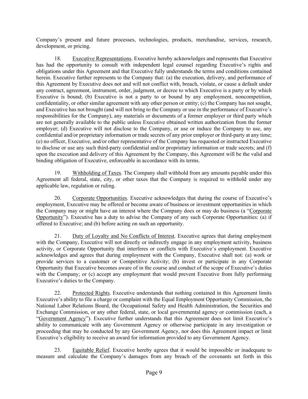 Page 9 Company’s present and future processes, technologies, products, merchandise, services, research, development, or pricing. 18. Executive Representations. Executive hereby acknowledges and represents that Executive has had the opportunity to consult with independent legal counsel regarding Executive’s rights and obligations under this Agreement and that Executive fully understands the terms and conditions contained herein. Executive further represents to the Company that: (a) the execution, delivery, and performance of this Agreement by Executive does not and will not conflict with, breach, violate, or cause a default under any contract, agreement, instrument, order, judgment, or decree to which Executive is a party or by which Executive is bound; (b) Executive is not a party to or bound by any employment, noncompetition, confidentiality, or other similar agreement with any other person or entity; (c) the Company has not sought, and Executive has not brought (and will not bring to the Company or use in the performance of Executive’s responsibilities for the Company), any materials or documents of a former employer or third party which are not generally available to the public unless Executive obtained written authorization from the former employer; (d) Executive will not disclose to the Company, or use or induce the Company to use, any confidential and/or proprietary information or trade secrets of any prior employer or third-party at any time; (e) no officer, Executive, and/or other representative of the Company has requested or instructed Executive to disclose or use any such third-party confidential and/or proprietary information or trade secrets; and (f) upon the execution and delivery of this Agreement by the Company, this Agreement will be the valid and binding obligation of Executive, enforceable in accordance with its terms. 19. Withholding of Taxes. The Company shall withhold from any amounts payable under this Agreement all federal, state, city, or other taxes that the Company is required to withhold under any applicable law, regulation or ruling. 20. Corporate Opportunities. Executive acknowledges that during the course of Executive’s employment, Executive may be offered or become aware of business or investment opportunities in which the Company may or might have an interest where the Company does or may do business (a “Corporate Opportunity”). Executive has a duty to advise the Company of any such Corporate Opportunities: (a) if offered to Executive; and (b) before acting on such an opportunity. 21. Duty of Loyalty and No Conflicts of Interest. Executive agrees that during employment with the Company, Executive will not directly or indirectly engage in any employment activity, business activity, or Corporate Opportunity that interferes or conflicts with Executive’s employment. Executive acknowledges and agrees that during employment with the Company, Executive shall not: (a) work or provide services to a customer or Competitive Activity; (b) invest or participate in any Corporate Opportunity that Executive becomes aware of in the course and conduct of the scope of Executive’s duties with the Company; or (c) accept any employment that would prevent Executive from fully performing Executive’s duties to the Company. 22. Protected Rights. Executive understands that nothing contained in this Agreement limits Executive’s ability to file a charge or complaint with the Equal Employment Opportunity Commission, the National Labor Relations Board, the Occupational Safety and Health Administration, the Securities and Exchange Commission, or any other federal, state, or local governmental agency or commission (each, a “Government Agency”). Executive further understands that this Agreement does not limit Executive’s ability to communicate with any Government Agency or otherwise participate in any investigation or proceeding that may be conducted by any Government Agency, nor does this Agreement impact or limit Executive’s eligibility to receive an award for information provided to any Government Agency. 23. Equitable Relief. Executive hereby agrees that it would be impossible or inadequate to measure and calculate the Company’s damages from any breach of the covenants set forth in this