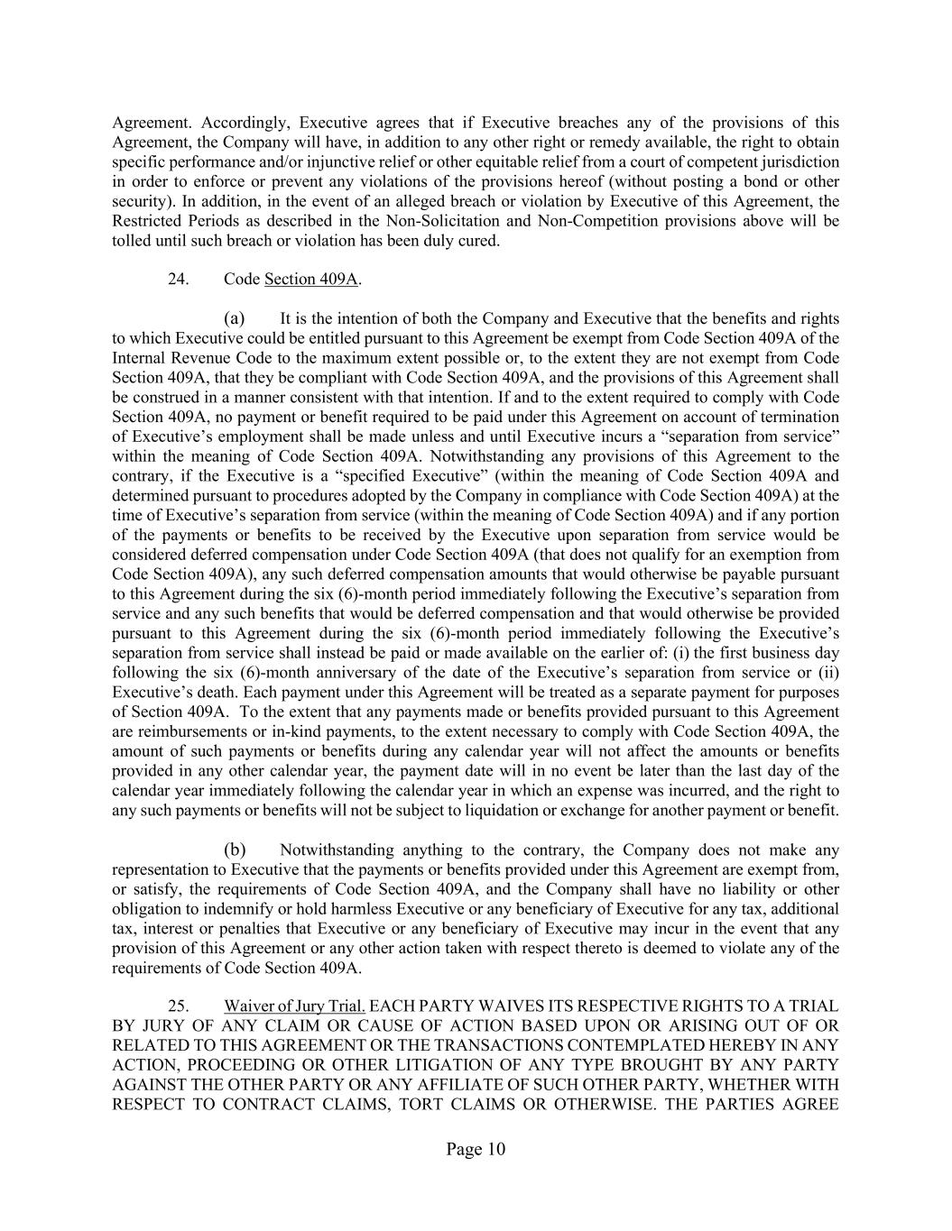 Page 10 Agreement. Accordingly, Executive agrees that if Executive breaches any of the provisions of this Agreement, the Company will have, in addition to any other right or remedy available, the right to obtain specific performance and/or injunctive relief or other equitable relief from a court of competent jurisdiction in order to enforce or prevent any violations of the provisions hereof (without posting a bond or other security). In addition, in the event of an alleged breach or violation by Executive of this Agreement, the Restricted Periods as described in the Non-Solicitation and Non-Competition provisions above will be tolled until such breach or violation has been duly cured. 24. Code Section 409A. (a) It is the intention of both the Company and Executive that the benefits and rights to which Executive could be entitled pursuant to this Agreement be exempt from Code Section 409A of the Internal Revenue Code to the maximum extent possible or, to the extent they are not exempt from Code Section 409A, that they be compliant with Code Section 409A, and the provisions of this Agreement shall be construed in a manner consistent with that intention. If and to the extent required to comply with Code Section 409A, no payment or benefit required to be paid under this Agreement on account of termination of Executive’s employment shall be made unless and until Executive incurs a “separation from service” within the meaning of Code Section 409A. Notwithstanding any provisions of this Agreement to the contrary, if the Executive is a “specified Executive” (within the meaning of Code Section 409A and determined pursuant to procedures adopted by the Company in compliance with Code Section 409A) at the time of Executive’s separation from service (within the meaning of Code Section 409A) and if any portion of the payments or benefits to be received by the Executive upon separation from service would be considered deferred compensation under Code Section 409A (that does not qualify for an exemption from Code Section 409A), any such deferred compensation amounts that would otherwise be payable pursuant to this Agreement during the six (6)-month period immediately following the Executive’s separation from service and any such benefits that would be deferred compensation and that would otherwise be provided pursuant to this Agreement during the six (6)-month period immediately following the Executive’s separation from service shall instead be paid or made available on the earlier of: (i) the first business day following the six (6)-month anniversary of the date of the Executive’s separation from service or (ii) Executive’s death. Each payment under this Agreement will be treated as a separate payment for purposes of Section 409A. To the extent that any payments made or benefits provided pursuant to this Agreement are reimbursements or in-kind payments, to the extent necessary to comply with Code Section 409A, the amount of such payments or benefits during any calendar year will not affect the amounts or benefits provided in any other calendar year, the payment date will in no event be later than the last day of the calendar year immediately following the calendar year in which an expense was incurred, and the right to any such payments or benefits will not be subject to liquidation or exchange for another payment or benefit. (b) Notwithstanding anything to the contrary, the Company does not make any representation to Executive that the payments or benefits provided under this Agreement are exempt from, or satisfy, the requirements of Code Section 409A, and the Company shall have no liability or other obligation to indemnify or hold harmless Executive or any beneficiary of Executive for any tax, additional tax, interest or penalties that Executive or any beneficiary of Executive may incur in the event that any provision of this Agreement or any other action taken with respect thereto is deemed to violate any of the requirements of Code Section 409A. 25. Waiver of Jury Trial. EACH PARTY WAIVES ITS RESPECTIVE RIGHTS TO A TRIAL BY JURY OF ANY CLAIM OR CAUSE OF ACTION BASED UPON OR ARISING OUT OF OR RELATED TO THIS AGREEMENT OR THE TRANSACTIONS CONTEMPLATED HEREBY IN ANY ACTION, PROCEEDING OR OTHER LITIGATION OF ANY TYPE BROUGHT BY ANY PARTY AGAINST THE OTHER PARTY OR ANY AFFILIATE OF SUCH OTHER PARTY, WHETHER WITH RESPECT TO CONTRACT CLAIMS, TORT CLAIMS OR OTHERWISE. THE PARTIES AGREE