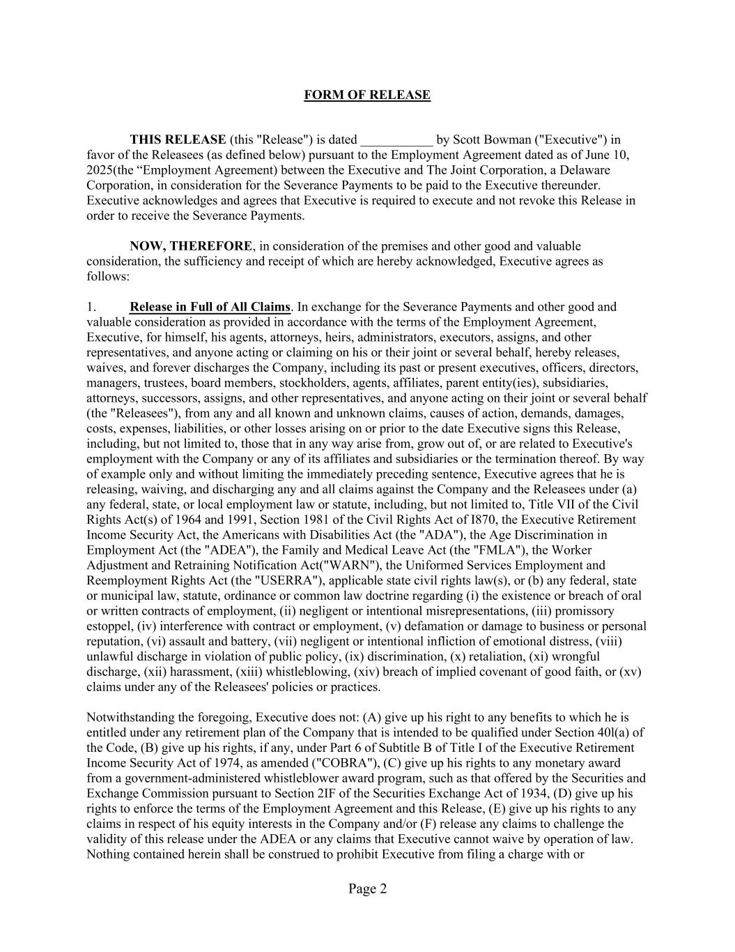 FORM OF RELEASE THIS RELEASE (this "Release") is dated ___________ by Scott Bowman ("Executive") in favor of the Releasees (as defined below) pursuant to the Employment Agreement dated as of June 10, 2025(the “Employment Agreement) between the Executive and The Joint Corporation, a Delaware Corporation, in consideration for the Severance Payments to be paid to the Executive thereunder. Executive acknowledges and agrees that Executive is required to execute and not revoke this Release in order to receive the Severance Payments. NOW, THEREFORE, in consideration of the premises and other good and valuable consideration, the sufficiency and receipt of which are hereby acknowledged, Executive agrees as follows: 1. Release in Full of All Claims. In exchange for the Severance Payments and other good and valuable consideration as provided in accordance with the terms of the Employment Agreement, Executive, for himself, his agents, attorneys, heirs, administrators, executors, assigns, and other representatives, and anyone acting or claiming on his or their joint or several behalf, hereby releases, waives, and forever discharges the Company, including its past or present executives, officers, directors, managers, trustees, board members, stockholders, agents, affiliates, parent entity(ies), subsidiaries, attorneys, successors, assigns, and other representatives, and anyone acting on their joint or several behalf (the "Releasees"), from any and all known and unknown claims, causes of action, demands, damages, costs, expenses, liabilities, or other losses arising on or prior to the date Executive signs this Release, including, but not limited to, those that in any way arise from, grow out of, or are related to Executive's employment with the Company or any of its affiliates and subsidiaries or the termination thereof. By way of example only and without limiting the immediately preceding sentence, Executive agrees that he is releasing, waiving, and discharging any and all claims against the Company and the Releasees under (a) any federal, state, or local employment law or statute, including, but not limited to, Title VII of the Civil Rights Act(s) of 1964 and 1991, Section 1981 of the Civil Rights Act of I870, the Executive Retirement Income Security Act, the Americans with Disabilities Act (the "ADA"), the Age Discrimination in Employment Act (the "ADEA''), the Family and Medical Leave Act (the "FMLA"), the Worker Adjustment and Retraining Notification Act("WARN"), the Uniformed Services Employment and Reemployment Rights Act (the "USERRA"), applicable state civil rights law(s), or (b) any federal, state or municipal law, statute, ordinance or common law doctrine regarding (i) the existence or breach of oral or written contracts of employment, (ii) negligent or intentional misrepresentations, (iii) promissory estoppel, (iv) interference with contract or employment, (v) defamation or damage to business or personal reputation, (vi) assault and battery, (vii) negligent or intentional infliction of emotional distress, (viii) unlawful discharge in violation of public policy, (ix) discrimination, (x) retaliation, (xi) wrongful discharge, (xii) harassment, (xiii) whistleblowing, (xiv) breach of implied covenant of good faith, or (xv) claims under any of the Releasees' policies or practices. Notwithstanding the foregoing, Executive does not: (A) give up his right to any benefits to which he is entitled under any retirement plan of the Company that is intended to be qualified under Section 40l(a) of the Code, (B) give up his rights, if any, under Part 6 of Subtitle B of Title I of the Executive Retirement Income Security Act of 1974, as amended ("COBRA"), (C) give up his rights to any monetary award from a government-administered whistleblower award program, such as that offered by the Securities and Exchange Commission pursuant to Section 2IF of the Securities Exchange Act of 1934, (D) give up his rights to enforce the terms of the Employment Agreement and this Release, (E) give up his rights to any claims in respect of his equity interests in the Company and/or (F) release any claims to challenge the validity of this release under the ADEA or any claims that Executive cannot waive by operation of law. Nothing contained herein shall be construed to prohibit Executive from filing a charge with or Page 2
