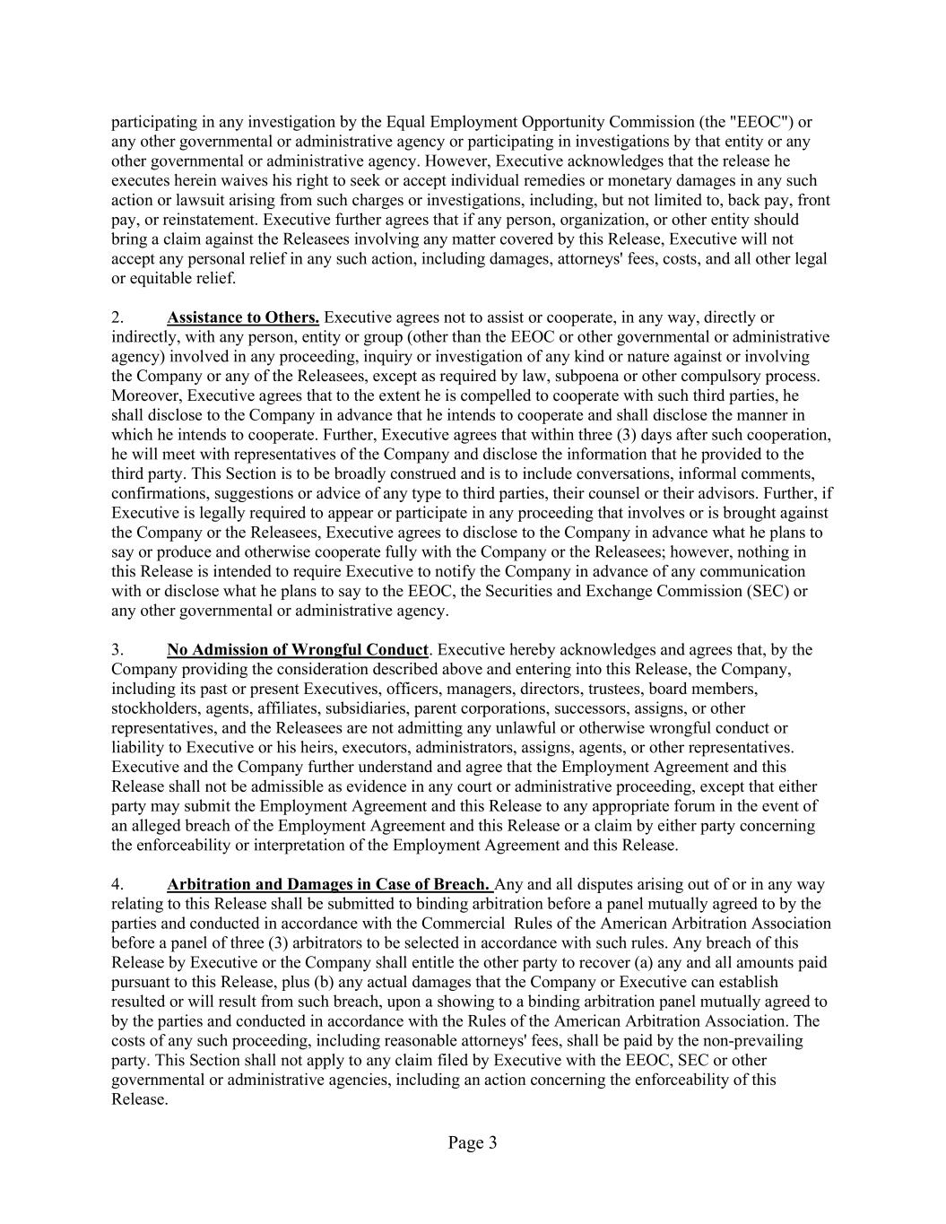 Page 3 participating in any investigation by the Equal Employment Opportunity Commission (the "EEOC") or any other governmental or administrative agency or participating in investigations by that entity or any other governmental or administrative agency. However, Executive acknowledges that the release he executes herein waives his right to seek or accept individual remedies or monetary damages in any such action or lawsuit arising from such charges or investigations, including, but not limited to, back pay, front pay, or reinstatement. Executive further agrees that if any person, organization, or other entity should bring a claim against the Releasees involving any matter covered by this Release, Executive will not accept any personal relief in any such action, including damages, attorneys' fees, costs, and all other legal or equitable relief. 2. Assistance to Others. Executive agrees not to assist or cooperate, in any way, directly or indirectly, with any person, entity or group (other than the EEOC or other governmental or administrative agency) involved in any proceeding, inquiry or investigation of any kind or nature against or involving the Company or any of the Releasees, except as required by law, subpoena or other compulsory process. Moreover, Executive agrees that to the extent he is compelled to cooperate with such third parties, he shall disclose to the Company in advance that he intends to cooperate and shall disclose the manner in which he intends to cooperate. Further, Executive agrees that within three (3) days after such cooperation, he will meet with representatives of the Company and disclose the information that he provided to the third party. This Section is to be broadly construed and is to include conversations, informal comments, confirmations, suggestions or advice of any type to third parties, their counsel or their advisors. Further, if Executive is legally required to appear or participate in any proceeding that involves or is brought against the Company or the Releasees, Executive agrees to disclose to the Company in advance what he plans to say or produce and otherwise cooperate fully with the Company or the Releasees; however, nothing in this Release is intended to require Executive to notify the Company in advance of any communication with or disclose what he plans to say to the EEOC, the Securities and Exchange Commission (SEC) or any other governmental or administrative agency. 3. No Admission of Wrongful Conduct. Executive hereby acknowledges and agrees that, by the Company providing the consideration described above and entering into this Release, the Company, including its past or present Executives, officers, managers, directors, trustees, board members, stockholders, agents, affiliates, subsidiaries, parent corporations, successors, assigns, or other representatives, and the Releasees are not admitting any unlawful or otherwise wrongful conduct or liability to Executive or his heirs, executors, administrators, assigns, agents, or other representatives. Executive and the Company further understand and agree that the Employment Agreement and this Release shall not be admissible as evidence in any court or administrative proceeding, except that either party may submit the Employment Agreement and this Release to any appropriate forum in the event of an alleged breach of the Employment Agreement and this Release or a claim by either party concerning the enforceability or interpretation of the Employment Agreement and this Release. 4. Arbitration and Damages in Case of Breach. Any and all disputes arising out of or in any way relating to this Release shall be submitted to binding arbitration before a panel mutually agreed to by the parties and conducted in accordance with the Commercial Rules of the American Arbitration Association before a panel of three (3) arbitrators to be selected in accordance with such rules. Any breach of this Release by Executive or the Company shall entitle the other party to recover (a) any and all amounts paid pursuant to this Release, plus (b) any actual damages that the Company or Executive can establish resulted or will result from such breach, upon a showing to a binding arbitration panel mutually agreed to by the parties and conducted in accordance with the Rules of the American Arbitration Association. The costs of any such proceeding, including reasonable attorneys' fees, shall be paid by the non-prevailing party. This Section shall not apply to any claim filed by Executive with the EEOC, SEC or other governmental or administrative agencies, including an action concerning the enforceability of this Release.