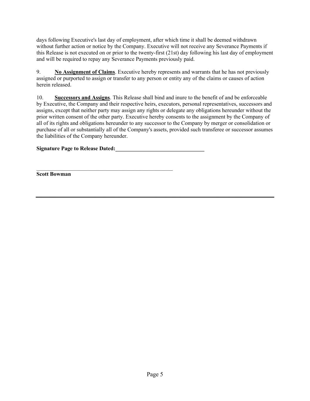 Page 5 days following Executive's last day of employment, after which time it shall be deemed withdrawn without further action or notice by the Company. Executive will not receive any Severance Payments if this Release is not executed on or prior to the twenty-first (21st) day following his last day of employment and will be required to repay any Severance Payments previously paid. 9. No Assignment of Claims. Executive hereby represents and warrants that he has not previously assigned or purported to assign or transfer to any person or entity any of the claims or causes of action herein released. 10. Successors and Assigns. This Release shall bind and inure to the benefit of and be enforceable by Executive, the Company and their respective heirs, executors, personal representatives, successors and assigns, except that neither party may assign any rights or delegate any obligations hereunder without the prior written consent of the other party. Executive hereby consents to the assignment by the Company of all of its rights and obligations hereunder to any successor to the Company by merger or consolidation or purchase of all or substantially all of the Company's assets, provided such transferee or successor assumes the liabilities of the Company hereunder. Signature Page to Release Dated:________________________________ _________________________________________________ Scott Bowman