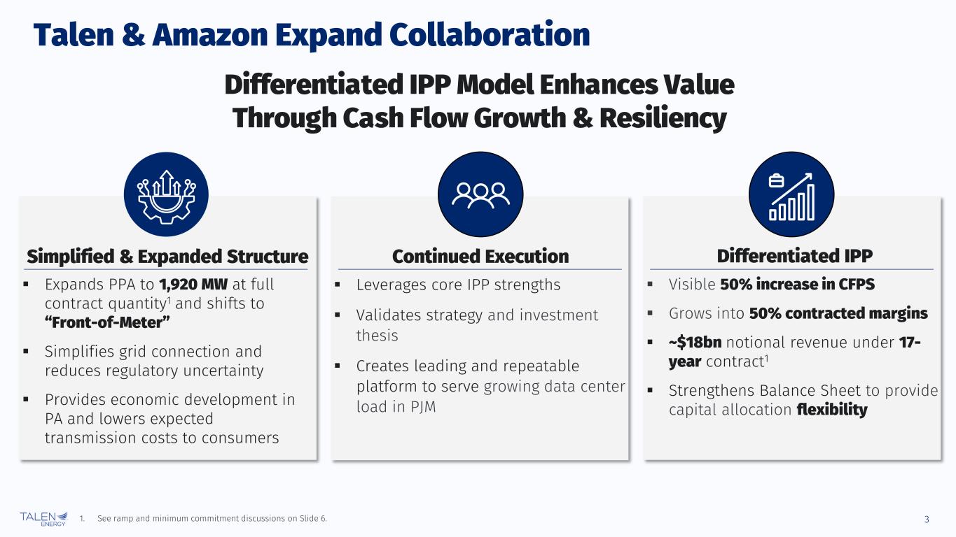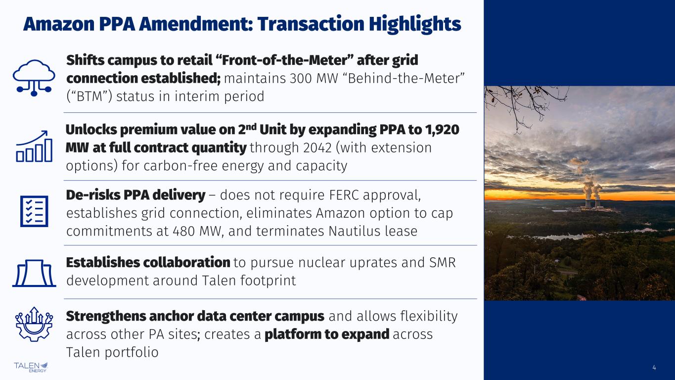 The existing Susquehanna co-located load arrangement between Talen and Amazon will transition to a “front-of-the-meter” arrangement after the completion of transmission reconfigurations expected in the Spring of 2026, concurrent with Susquehanna’s refueling outage. Under the terms of the new agreement, Susquehanna will provide its carbon-free power to the PJM grid, Talen will act as the retail electric generation supplier to Amazon, and PPL Electric Utilities (“PPL”) will be responsible for transmission and delivery.