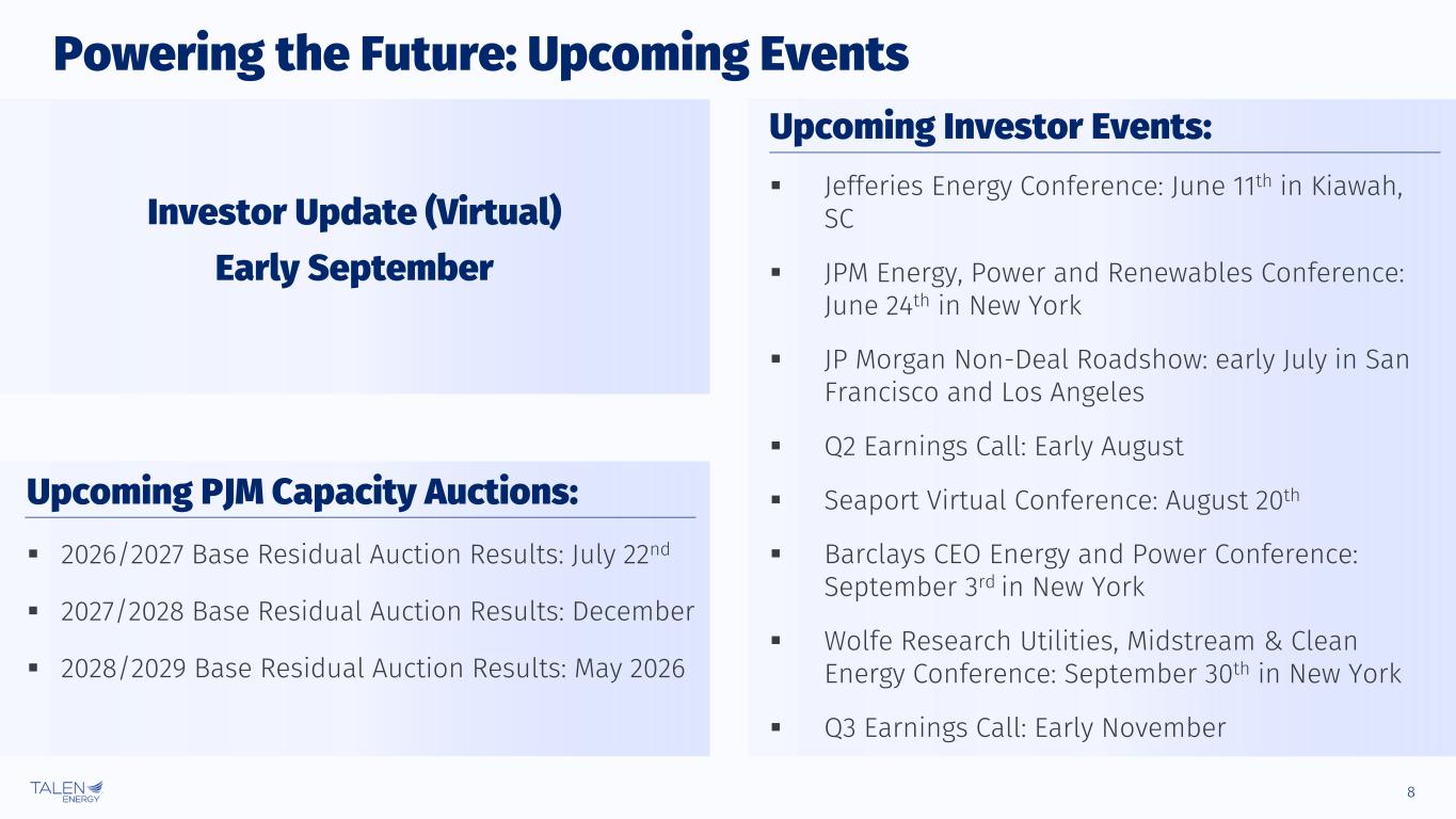 Talen will host an investor call at 8:00 a.m. EDT today, Wednesday, June 11, 2025. To participate in the call, please register for the webcast via the page linked here. Participants can also join by phone by registering via the form linked here prior to the start time of the call to receive a conference call dial-in number. For those unable to participate in the live event, a digital replay will be archived for approximately one year and available on the Events page of Talen's Investor Relations website linked here.