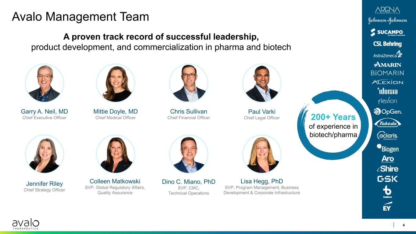 Avalo Therapeutics: Advancing the Next-Generation of IL-1β Inhibition for Immune Mediated Inflammatory Diseases 3 IL, interleukin; IND, investigational new drug application; mAB, monoclonal antibody; MOA, mechanism of action. 1. Vossen ARJV, et al. J Invest Dermatol. 2020;140(7):1463-1466.e2; 2. Kelly G, et al. Br J Dermatol. 2015;173(6):1431-1439; 3. Kimball AB, et al. Presented at: American Academy of Dermatology; March 8-12, 2024; San Diego, CA; 4. Bihorel S, et al. AAPS J. 2014;16(5):1009-1017; 5. HS Market Research 2024. Lead compound AVTX-009 (anti-IL-1β mAb) has the potential for best-in-class and best-in-disease profile in hidradenitis suppurativa (HS) • Significant unmet need due to incomplete response and loss of response to current treatment • Abbvie’s lutikizumab (IL-1α/β) demonstrated comparable efficacy to market leaders and pipeline therapeutics, and in a refractory population that had failed anti-TNF therapy • IL-1β (not IL-1α) is a dominant immunoregulator in HS, based on preclinical and clinical evidence1,2,3 • AVTX-009 has 15x higher affinity and a longer half-life than lutikizumab, potentially predictive of higher efficacy and less frequent dosing4 Phase 2 LOTUS trial in HS enrolling with topline data expected mid-2026 HS market is expected to grow to > $10B by 20355 AVTX-009 has the potential to treat additional immune- mediated inflammatory diseases Expected cash runway into 2028