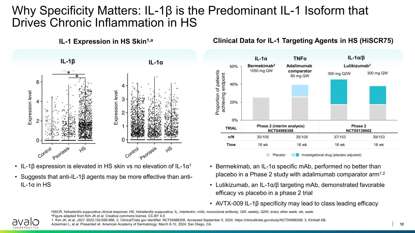 Specificity IL-1 (α&β) IL-1β IL-1β binding affinity 44 KD (pM) <3 KD (pM) Subcutaneous bioavailability 46% 73% Half-life 10-14 days 19 days Dosing evaluated in HS study Q1W & Q2W4 Q2W & Q4W5 AVTX-009 Potential Profile Advantages: IL-1β Specificity, Higher Affinity, Bioavailability, and Longer Half-Life than Lutikizumab 11 KD, dissociation constant; pM, picomolar. 1. Lacy SE, et al. mAbs. 2015;7(3):605-619; 2. Wang SX, et al. Osteoarthritis Cartilage. 2017;25(12):1952-1961; 3. Bihorel S, et al. AAPS J. 2014;16(5):1009-1017; 4. Clinicaltrials.gov. NCT06468228. https://clinicaltrials.gov/study/NCT06468228. Accessed November 26, 2024; 5. Clinicaltrials.gov. NCT06603077. https://clinicaltrials.gov/study/NCT06603077. Accessed November 26, 2024. Lutikizumab1,2 AVTX-0093 IL-1β Potential AVTX-009 profile advantages in HS Potential to translate to higher efficacy Potential for less frequent dosing IL-1β IL-1α