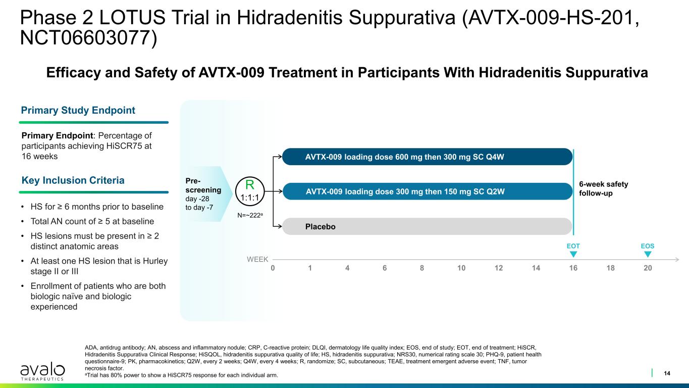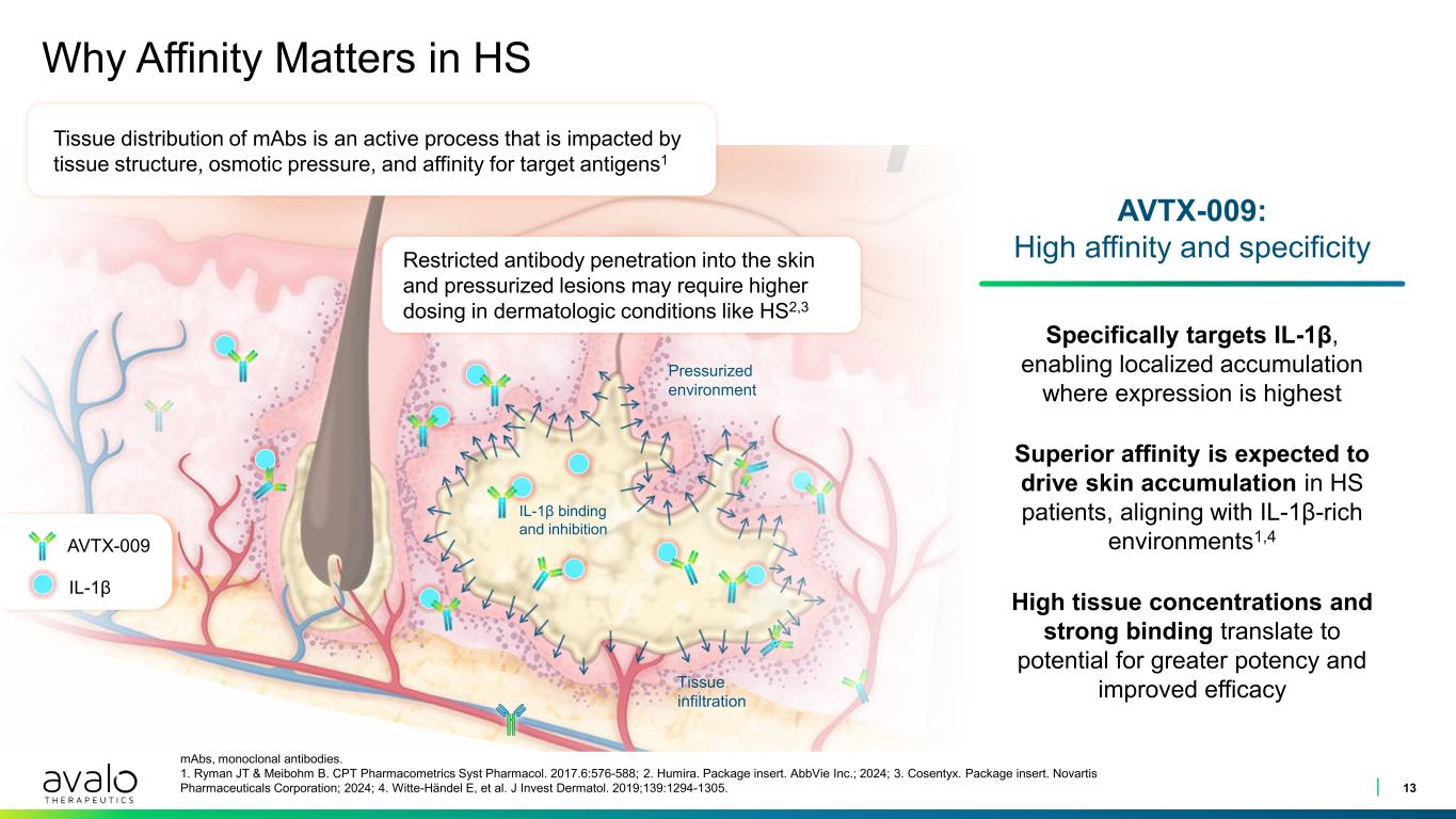 Why Affinity Matters in HS 13 mAbs, monoclonal antibodies. 1. Ryman JT & Meibohm B. CPT Pharmacometrics Syst Pharmacol. 2017.6:576-588; 2. Humira. Package insert. AbbVie Inc.; 2024; 3. Cosentyx. Package insert. Novartis Pharmaceuticals Corporation; 2024; 4. Witte-Händel E, et al. J Invest Dermatol. 2019;139:1294-1305. IL-1β AVTX-009 Tissue distribution of mAbs is an active process that is impacted by tissue structure, osmotic pressure, and affinity for target antigens1 AVTX-009: High affinity and specificity Specifically targets IL-1β, enabling localized accumulation where expression is highest Restricted antibody penetration into the skin and pressurized lesions may require higher dosing in dermatologic conditions like HS2,3 IL-1β binding and inhibition Pressurized environment Tissue infiltration Superior affinity is expected to drive skin accumulation in HS patients, aligning with IL-1β-rich environments1,4 High tissue concentrations and strong binding translate to potential for greater potency and improved efficacy