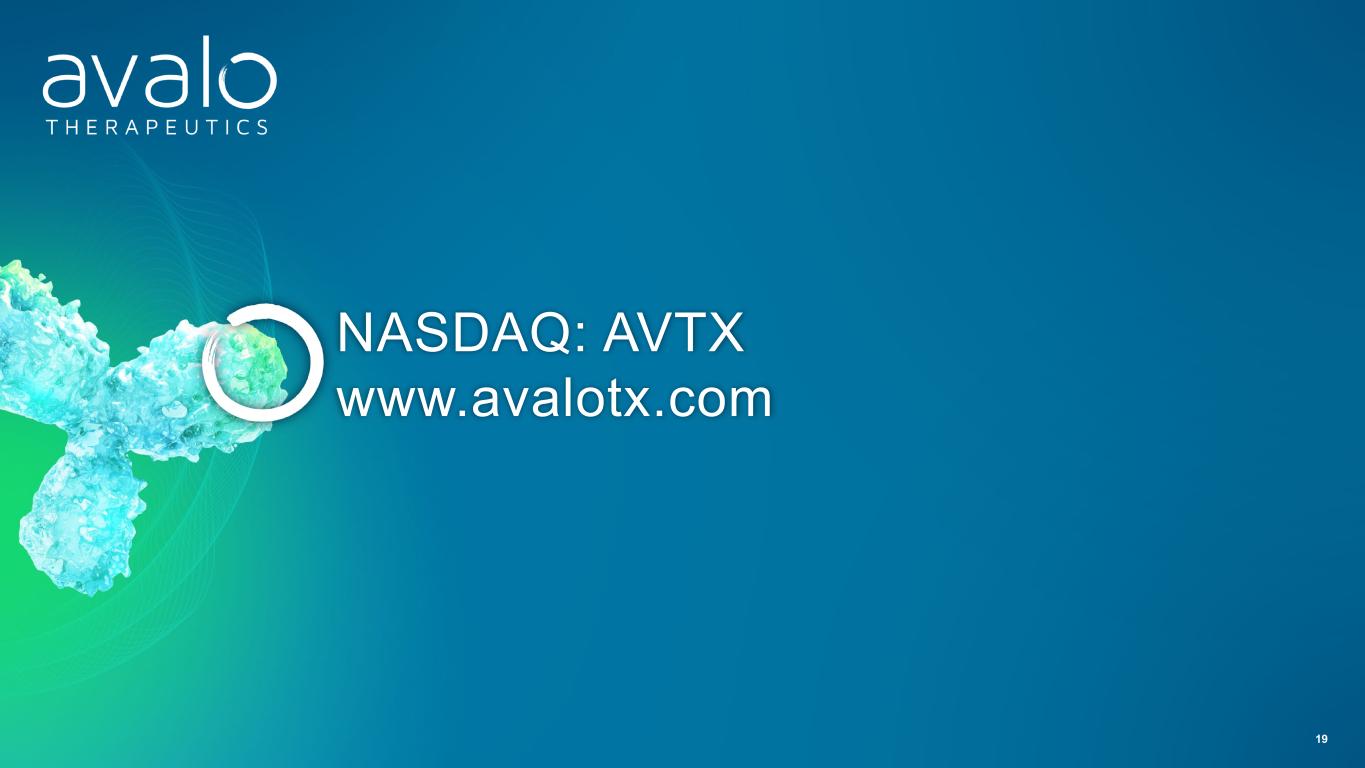 Avalo Summary (NASDAQ: AVTX) 18 IL, interleukin; mAB, monoclonal antibody. 1.Dinarello CA. Immunol Rev. 2018;281(1):8-27; 2. Bihorel S, et al. AAPS J. 2014;16(5):1009-1017; 3. Lacy SE, et al. mAbs. 2015;7(3):605-619; 2. Wang SX, et al. Osteoarthritis Cartilage. 2017;25(12):1952-1961; 4. Clinicaltrials.gov. NCT06468228. https://clinicaltrials.gov/study/NCT06468228. Accessed November 26, 2024; 5. Clinicaltrials.gov. NCT06603077. https://clinicaltrials.gov/study/NCT06603077. Accessed November 26, 2024.; 5. HS Market Research 2024. OUR APPROACH: Next generation therapies targeting IL-1β, a master regulator of inflammation1 LEAD ASSET AVTX-009: A high-affinity, IL-1β–specific mAb2 Differentiated Profile: 15x higher affinity and longer half-life than lutikizumab; potential for best-in-class and best-in-disease profile with increased efficacy and less frequent dosing2-5 Lead Indication – Hidradenitis Suppurativa (HS): Projected to become a $10B+ market by 20355 driven by growth in diagnosis and treatment + high patient need due to incomplete response rates for available anti-TNF and anti-IL-17 therapies Clinical Momentum: Phase 2 LOTUS trial in HS is enrolling; topline data expected mid-2026 Broad Potential: Scientific and clinical rationale for expansion into additional IL-1β–driven diseases Strong Financial Foundation: Cash runway into 2028