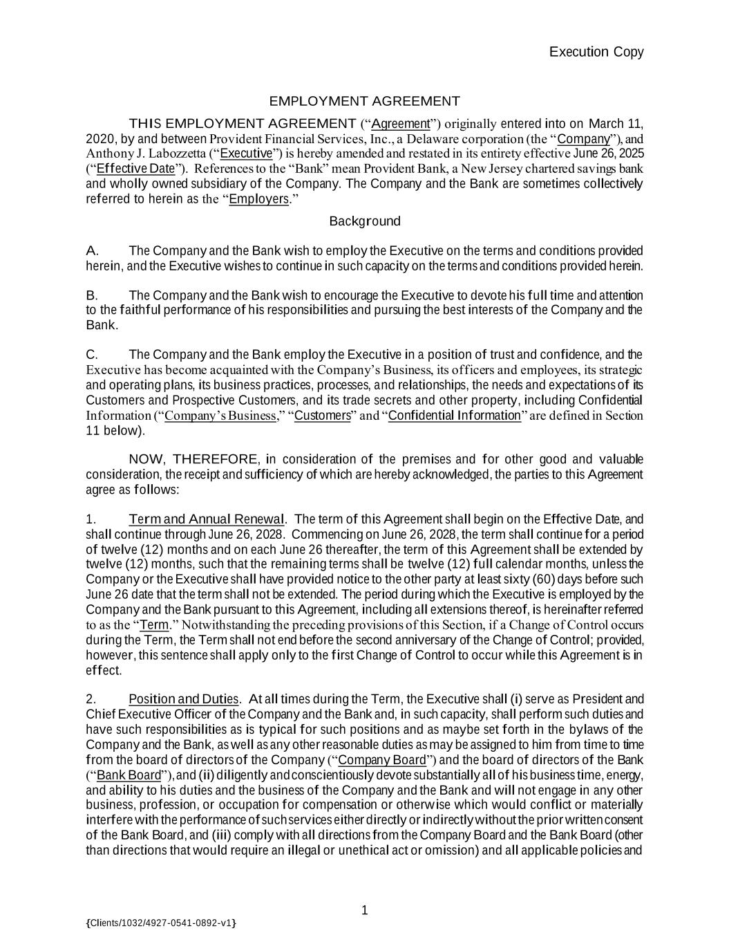 Execution Copy 1 {Clients/1032/4927-0541-0892-v1} EMPLOYMENT AGREEMENT THIS EMPLOYMENT AGREEMENT (“Agreement”) originally entered into on March 11, 2020, by and between Provident Financial Services, Inc., a Delaware corporation (the “Company”), and Anthony J. Labozzetta (“Executive”) is hereby amended and restated in its entirety effective June 26, 2025 (“Effective Date”). References to the “Bank” mean Provident Bank, a New Jersey chartered savings bank and wholly owned subsidiary of the Company. The Company and the Bank are sometimes collectively referred to herein as the “Employers.” Background A. The Company and the Bank wish to employ the Executive on the terms and conditions provided herein, and the Executive wishes to continue in such capacity on the terms and conditions provided herein. B. The Company and the Bank wish to encourage the Executive to devote his full time and attention to the faithful performance of his responsibilities and pursuing the best interests of the Company and the Bank. C. The Company and the Bank employ the Executive in a position of trust and confidence, and the Executive has become acquainted with the Company’s Business, its officers and employees, its strategic and operating plans, its business practices, processes, and relationships, the needs and expectations of its Customers and Prospective Customers, and its trade secrets and other property, including Confidential Information (“Company’s Business,” “Customers” and “Confidential Information” are defined in Section 11 below). NOW, THEREFORE, in consideration of the premises and for other good and valuable consideration, the receipt and sufficiency of which are hereby acknowledged, the parties to this Agreement agree as follows: 1. Term and Annual Renewal. The term of this Agreement shall begin on the Effective Date, and shall continue through June 26, 2028. Commencing on June 26, 2028, the term shall continue for a period of twelve (12) months and on each June 26 thereafter, the term of this Agreement shall be extended by twelve (12) months, such that the remaining terms shall be twelve (12) full calendar months, unless the Company or the Executive shall have provided notice to the other party at least sixty (60) days before such June 26 date that the term shall not be extended. The period during which the Executive is employed by the Company and the Bank pursuant to this Agreement, including all extensions thereof, is hereinafter referred to as the “Term.” Notwithstanding the preceding provisions of this Section, if a Change of Control occurs during the Term, the Term shall not end before the second anniversary of the Change of Control; provided, however, this sentence shall apply only to the first Change of Control to occur while this Agreement is in effect. 2. Position and Duties. At all times during the Term, the Executive shall (i) serve as President and Chief Executive Officer of the Company and the Bank and, in such capacity, shall perform such duties and have such responsibilities as is typical for such positions and as maybe set forth in the bylaws of the Company and the Bank, as well as any other reasonable duties as may be assigned to him from time to time from the board of directors of the Company (“Company Board”) and the board of directors of the Bank (“Bank Board”), and (ii) diligently and conscientiously devote substantially all of his business time, energy, and ability to his duties and the business of the Company and the Bank and will not engage in any other business, profession, or occupation for compensation or otherwise which would conflict or materially interfere with the performance of such services either directly or indirectly without the prior written consent of the Bank Board, and (iii) comply with all directions from the Company Board and the Bank Board (other than directions that would require an illegal or unethical act or omission) and all applicable policies and