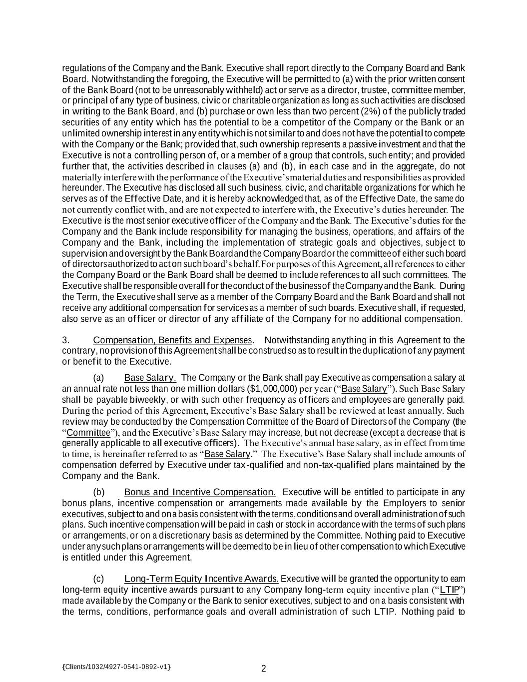 {Clients/1032/4927-0541-0892-v1} 2 regulations of the Company and the Bank. Executive shall report directly to the Company Board and Bank Board. Notwithstanding the foregoing, the Executive will be permitted to (a) with the prior written consent of the Bank Board (not to be unreasonably withheld) act or serve as a director, trustee, committee member, or principal of any type of business, civic or charitable organization as long as such activities are disclosed in writing to the Bank Board, and (b) purchase or own less than two percent (2%) o f the publicly traded securities of any entity which has the potential to be a competitor of the Company or the Bank or an unlimited ownership interest in any entity which is not similar to and does not have the potential to compete with the Company or the Bank; provided that, such ownership represents a passive investment and that the Executive is not a controlling person of, or a member of a group that controls, such entity; and provided further that, the activities described in clauses (a) and (b), in each case and in the aggregate, do not materially interfere with the performance of the Executive’s material duties and responsibilities as provided hereunder. The Executive has disclosed all such business, civic, and charitable organizations for which he serves as of the Effective Date, and it is hereby acknowledged that, as of the Effective Date, the same do not currently conflict with, and are not expected to interfere with, the Executive’s duties hereunder. The Executive is the most senior executive officer of the Company and the Bank. The Executive’s duties for the Company and the Bank include responsibility for managing the business, operations, and affairs of the Company and the Bank, including the implementation of strategic goals and objectives, subje ct to supervision and oversight by the Bank Board and the Company Board or the committee of either such board of directors authorized to act on such board’s behalf. For purposes of this Agreement, all references to either the Company Board or the Bank Board shall be deemed to include references to all such committees. The Executive shall be responsible overall for the conduct of the business of the Company and the Bank. During the Term, the Executive shall serve as a member of the Company Board and the Bank Board and shall not receive any additional compensation for services as a member of such boards. Executive shall, if requested, also serve as an officer or director of any affiliate of the Company for no additional compensation. 3. Compensation, Benefits and Expenses. Notwithstanding anything in this Agreement to the contrary, no provision of this Agreement shall be construed so as to result in the duplication of any payment or benefit to the Executive. (a) Base Salary. The Company or the Bank shall pay Executive as compensation a salary at an annual rate not less than one million dollars ($1,000,000) per year (“Base Salary”). Such Base Salary shall be payable biweekly, or with such other frequency as officers and employees are generally paid. During the period of this Agreement, Executive’s Base Salary shall be reviewed at least annually. Such review may be conducted by the Compensation Committee of the Board of Directors of the Company (the “Committee”), and the Executive’s Base Salary may increase, but not decrease (except a decrease that is generally applicable to all executive officers). The Executive’s annual base salary, as in effect from time to time, is hereinafter referred to as “Base Salary.” The Executive’s Base Salary shall include amounts of compensation deferred by Executive under tax-qualified and non-tax-qualified plans maintained by the Company and the Bank. (b) Bonus and Incentive Compensation. Executive will be entitled to participate in any bonus plans, incentive compensation or arrangements made available by the Employers to senior executives, subject to and on a basis consistent with the terms, conditions and overall administration of such plans. Such incentive compensation will be paid in cash or stock in accordance with the terms of such plans or arrangements, or on a discretionary basis as determined by the Committee. Nothing paid to Executive under any such plans or arrangements will be deemed to be in lieu of other compensation to which Executive is entitled under this Agreement. (c) Long-Term Equity Incentive Awards. Executive will be granted the opportunity to earn long-term equity incentive awards pursuant to any Company long-term equity incentive plan (“LTIP”) made available by the Company or the Bank to senior executives, subject to and on a basis consistent with the terms, conditions, performance goals and overall administration of such LTIP. Nothing paid to