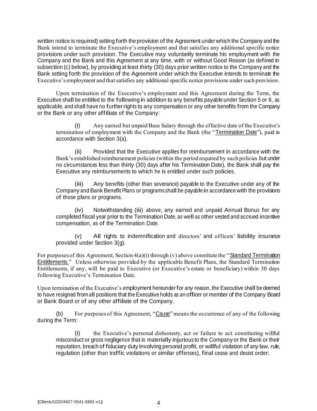 {Clients/1032/4927-0541-0892-v1} 4 written notice is required) setting forth the provision of the Agreement under which the Company and the Bank intend to terminate the Executive’s employment and that satisfies any additional specific notice provisions under such provision. The Executive may voluntarily terminate his employment with the Company and the Bank and this Agreement at any time, with or without Good Reason (as defined in subsection (c) below), by providing at least thirty (30) days prior written notice to the Company and the Bank setting forth the provision of the Agreement under which the Executive intends to terminate the Executive’s employment and that satisfies any additional specific notice provisions under such provision. Upon termination of the Executive’s employment and this Agreement during the Term, the Executive shall be entitled to the following in addition to any benefits payable under Section 5 or 6, as applicable, and shall have no further rights to any compensation or any other benefits from the Company or the Bank or any other affiliate of the Company: (i) Any earned but unpaid Base Salary through the effective date of the Executive’s termination of employment with the Company and the Bank (the “Termination Date”), paid in accordance with Section 3(a). (ii) Provided that the Executive applies for reimbursement in accordance with the Bank’s established reimbursement policies (within the period required by such policies but under no circumstances less than thirty (30) days after his Termination Date), the Bank shall pay the Executive any reimbursements to which he is entitled under such policies. (iii) Any benefits (other than severance) payable to the Executive under any of the Company and Bank Benefit Plans or programs shall be payable in accordance with the provisions of those plans or programs. (iv) Notwithstanding (iii) above, any earned and unpaid Annual Bonus for any completed fiscal year prior to the Termination Date, as well as other vested and accrued incentive compensation, as of the Termination Date. (v) All rights to indemnification and directors’ and officers’ liability insurance provided under Section 3(g). For purposes of this Agreement, Section 4(a)(i) through (v) above constitute the “Standard Termination Entitlements.” Unless otherwise provided by the applicable Benefit Plans, the Standard Termination Entitlements, if any, will be paid to Executive (or Executive’s estate or beneficiary) within 30 days following Executive’s Termination Date. Upon termination of the Executive’s employment hereunder for any reason, the Executive shall be deemed to have resigned from all positions that the Executive holds as an officer or member of the Company Board or Bank Board or of any other affiliate of the Company. (b) For purposes of this Agreement, “Cause” means the occurrence of any of the following during the Term: (i) the Executive’s personal dishonesty, act or failure to act constituting willful misconduct or gross negligence that is materially injurious to the Company or the Bank or their reputation, breach of fiduciary duty involving personal profit, or willful violation of any law, rule, regulation (other than traffic violations or similar offenses), final cease and desist order;