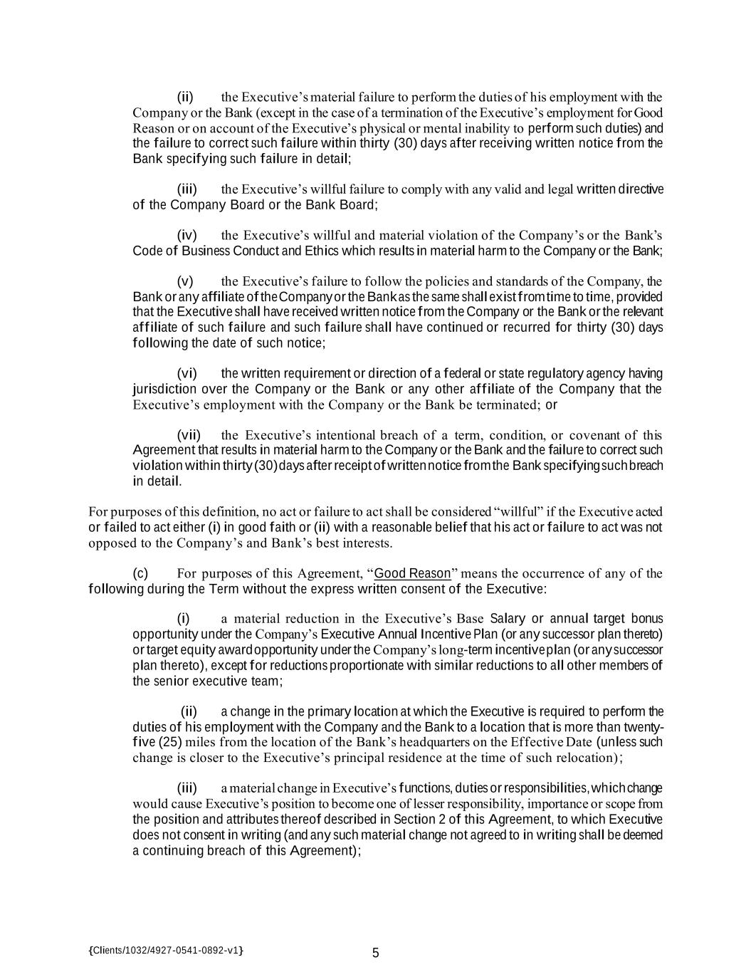 {Clients/1032/4927-0541-0892-v1} 5 (ii) the Executive’s material failure to perform the duties of his employment with the Company or the Bank (except in the case of a termination of the Executive’s employment for Good Reason or on account of the Executive’s physical or mental inability to perform such duties) and the failure to correct such failure within thirty (30) days after receiving written notice from the Bank specifying such failure in detail; (iii) the Executive’s willful failure to comply with any valid and legal written directive of the Company Board or the Bank Board; (iv) the Executive’s willful and material violation of the Company’s or the Bank’s Code of Business Conduct and Ethics which results in material harm to the Company or the Bank; (v) the Executive’s failure to follow the policies and standards of the Company, the Bank or any affiliate of the Company or the Bank as the same shall exist from time to time, provided that the Executive shall have received written notice from the Company or the Bank or the relevant affiliate of such failure and such failure shall have continued or recurred for thirty (30) days following the date of such notice; (vi) the written requirement or direction of a federal or state regulatory agency having jurisdiction over the Company or the Bank or any other affiliate of the Company that the Executive’s employment with the Company or the Bank be terminated; or (vii) the Executive’s intentional breach of a term, condition, or covenant of this Agreement that results in material harm to the Company or the Bank and the failure to correct such violation within thirty (30) days after receipt of written notice from the Bank specifying such breach in detail. For purposes of this definition, no act or failure to act shall be considered “willful” if the Executive acted or failed to act either (i) in good faith or (ii) with a reasonable belief that his act or failure to act was not opposed to the Company’s and Bank’s best interests. (c) For purposes of this Agreement, “Good Reason” means the occurrence of any of the following during the Term without the express written consent of the Executive: (i) a material reduction in the Executive’s Base Salary or annual target bonus opportunity under the Company’s Executive Annual Incentive Plan (or any successor plan thereto) or target equity award opportunity under the Company’s long-term incentive plan (or any successor plan thereto), except for reductions proportionate with similar reductions to all other members of the senior executive team; (ii) a change in the primary location at which the Executive is required to perform the duties of his employment with the Company and the Bank to a location that is more than twenty- five (25) miles from the location of the Bank’s headquarters on the Effective Date (unless such change is closer to the Executive’s principal residence at the time of such relocation) ; (iii) a material change in Executive’s functions, duties or responsibilities, which change would cause Executive’s position to become one of lesser responsibility, importance or scope from the position and attributes thereof described in Section 2 of this Agreement, to which Executive does not consent in writing (and any such material change not agreed to in writing shall be deemed a continuing breach of this Agreement);