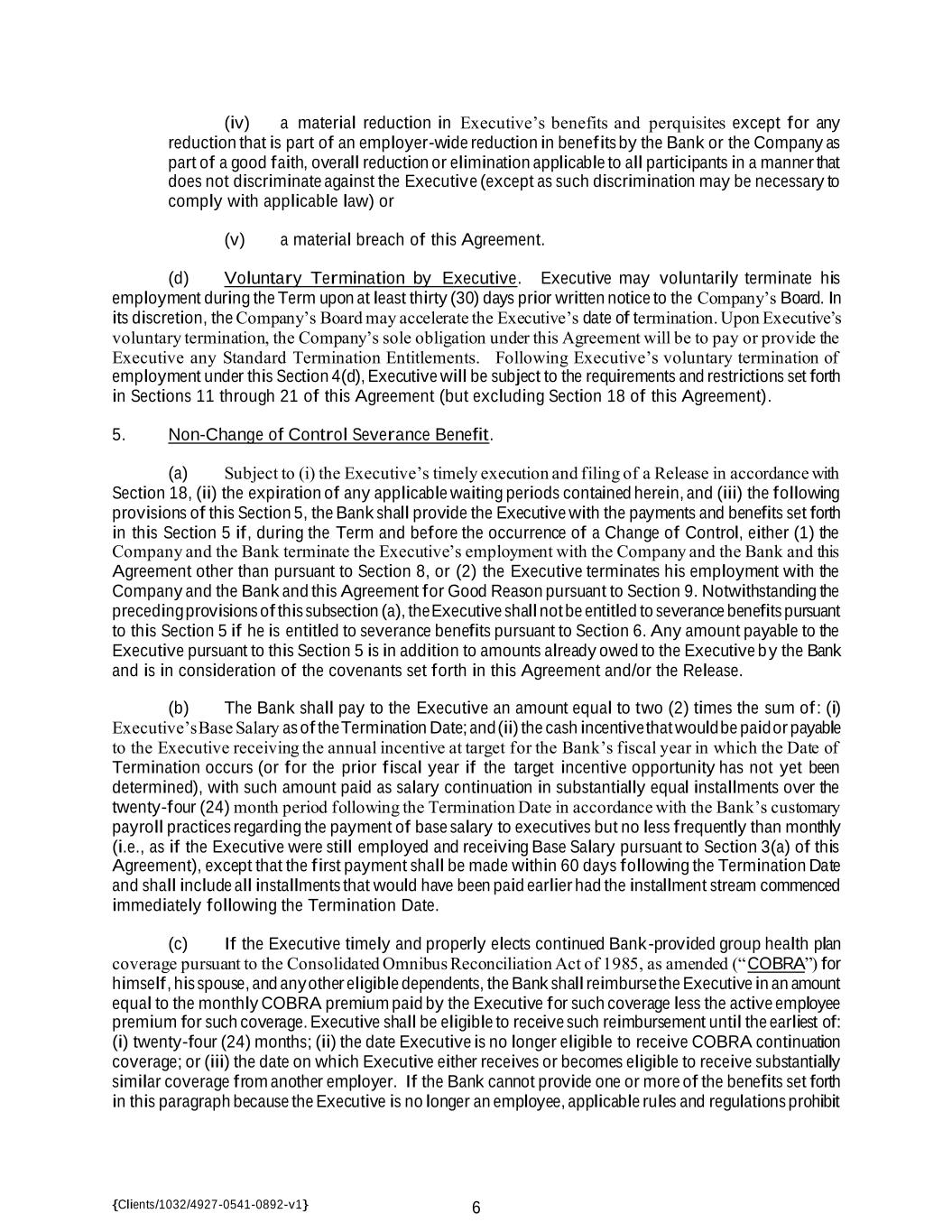 {Clients/1032/4927-0541-0892-v1} 6 (iv) a material reduction in Executive’s benefits and perquisites except for any reduction that is part of an employer-wide reduction in benefits by the Bank or the Company as part of a good faith, overall reduction or elimination applicable to all participants in a manner that does not discriminate against the Executive (except as such discrimination may be necessary to comply with applicable law) or (v) a material breach of this Agreement. (d) Voluntary Termination by Executive. Executive may voluntarily terminate his employment during the Term upon at least thirty (30) days prior written notice to the Company’s Board. In its discretion, the Company’s Board may accelerate the Executive’s date of termination. Upon Executive’s voluntary termination, the Company’s sole obligation under this Agreement will be to pay or provide the Executive any Standard Termination Entitlements. Following Executive’s voluntary termination of employment under this Section 4(d), Executive will be subject to the requirements and restrictions set forth in Sections 11 through 21 of this Agreement (but excluding Section 18 of this Agreement). 5. Non-Change of Control Severance Benefit. (a) Subject to (i) the Executive’s timely execution and filing of a Release in accordance with Section 18, (ii) the expiration of any applicable waiting periods contained herein, and (iii) the following provisions of this Section 5, the Bank shall provide the Executive with the payments and benefits set forth in this Section 5 if, during the Term and before the occurrence of a Change of Control, either (1) the Company and the Bank terminate the Executive’s employment with the Company and the Bank and this Agreement other than pursuant to Section 8, or (2) the Executive terminates his employment with the Company and the Bank and this Agreement for Good Reason pursuant to Section 9. Notwithstanding the preceding provisions of this subsection (a), the Executive shall not be entitled to severance benefits pursuant to this Section 5 if he is entitled to severance benefits pursuant to Section 6. Any amount payable to the Executive pursuant to this Section 5 is in addition to amounts already owed to the Executive by the Bank and is in consideration of the covenants set forth in this Agreement and/or the Release. (b) The Bank shall pay to the Executive an amount equal to two (2) times the sum of: (i) Executive’s Base Salary as of the Termination Date; and (ii) the cash incentive that would be paid or payable to the Executive receiving the annual incentive at target for the Bank’s fiscal year in which the Date of Termination occurs (or for the prior fiscal year if the target incentive opportunity has not yet been determined), with such amount paid as salary continuation in substantially equal installments over the twenty-four (24) month period following the Termination Date in accordance with the Bank’s customary payroll practices regarding the payment of base salary to executives but no less frequently than monthly (i.e., as if the Executive were still employed and receiving Base Salary pursuant to Section 3(a) of this Agreement), except that the first payment shall be made within 60 days following the Termination Date and shall include all installments that would have been paid earlier had the installment stream commenced immediately following the Termination Date. (c) If the Executive timely and properly elects continued Bank-provided group health plan coverage pursuant to the Consolidated Omnibus Reconciliation Act of 1985, as amended (“COBRA”) for himself, his spouse, and any other eligible dependents, the Bank shall reimburse the Executive in an amount equal to the monthly COBRA premium paid by the Executive for such coverage less the active employee premium for such coverage. Executive shall be eligible to receive such reimbursement until the earliest of: (i) twenty-four (24) months; (ii) the date Executive is no longer eligible to receive COBRA continuation coverage; or (iii) the date on which Executive either receives or becomes eligible to receive substantially similar coverage from another employer. If the Bank cannot provide one or more of the benefits set forth in this paragraph because the Executive is no longer an employee, applicable rules and regulations prohibit