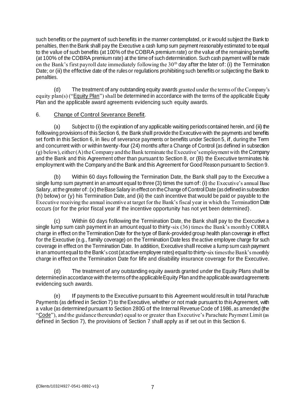{Clients/1032/4927-0541-0892-v1} 7 such benefits or the payment of such benefits in the manner contemplated, or it would subject the Bank to penalties, then the Bank shall pay the Executive a cash lump sum payment reasonably estimated to be equal to the value of such benefits (at 100% of the COBRA premium rate) or the value of the remaining benefits (at 100% of the COBRA premium rate) at the time of such determination. Such cash payment will be made on the Bank’s first payroll date immediately following the 30 th day after the later of: (i) the Termination Date; or (ii) the effective date of the rules or regulations prohibiting such benefits or subjecting the Bank to penalties. (d) The treatment of any outstanding equity awards granted under the terms of the Company’s equity plan(s) (“Equity Plan”) shall be determined in accordance with the terms of the applicable Equity Plan and the applicable award agreements evidencing such equity awards. 6. Change of Control Severance Benefit. (a) Subject to (i) the expiration of any applicable waiting periods contained herein, and (ii) the following provisions of this Section 6, the Bank shall provide the Executive with the payments and benefits set forth in this Section 6, in lieu of severance payments or benefits under Section 5, if, during the Term and concurrent with or within twenty-four (24) months after a Change of Control (as defined in subsection (g) below), either (A) the Company and the Bank terminate the Executive’s employment with the Company and the Bank and this Agreement other than pursuant to Section 8, or (B) the Executive terminates his employment with the Company and the Bank and this Agreement for Good Reason pursuant to Section 9. (b) Within 60 days following the Termination Date, the Bank shall pay to the Executive a single lump sum payment in an amount equal to three (3) times the sum of: (i) the Executive’s annual Base Salary, at the greater of: (x) the Base Salary in effect on the Change of Control Date (as defined in subsection (h) below) or (y) his Termination Date, and (ii) the cash incentive that would be paid or payable to the Executive receiving the annual incentive at target for the Bank’s fiscal year in which the Termination Date occurs (or for the prior fiscal year if the incentive opportunity has not yet been determined) . (c) Within 60 days following the Termination Date, the Bank shall pay to the Executive a single lump sum cash payment in an amount equal to thirty-six (36) times the Bank’s monthly COBRA charge in effect on the Termination Date for the type of Bank-provided group health plan coverage in effect for the Executive (e.g., family coverage) on the Termination Date less the active employee charge for such coverage in effect on the Termination Date. In addition, Executive shall receive a lump sum cash payment in an amount equal to the Bank’s cost (at active employee rates) equal to thirty-six times the Bank’s monthly charge in effect on the Termination Date for life and disability insurance coverage for the Executive. (d) The treatment of any outstanding equity awards granted under the Equity Plans shall be determined in accordance with the terms of the applicable Equity Plan and the applicable award agreements evidencing such awards. (e) If payments to the Executive pursuant to this Agreement would result in total Parachute Payments (as defined in Section 7) to the Executive, whether or not made pursuant to this Agreement, with a value (as determined pursuant to Section 280G of the Internal Revenue Code of 1986, as amended (the “Code”), and the guidance thereunder) equal to or greater than Executive’s Parachute Payment Limit (as defined in Section 7), the provisions of Section 7 shall apply as if set out in this Section 6.
