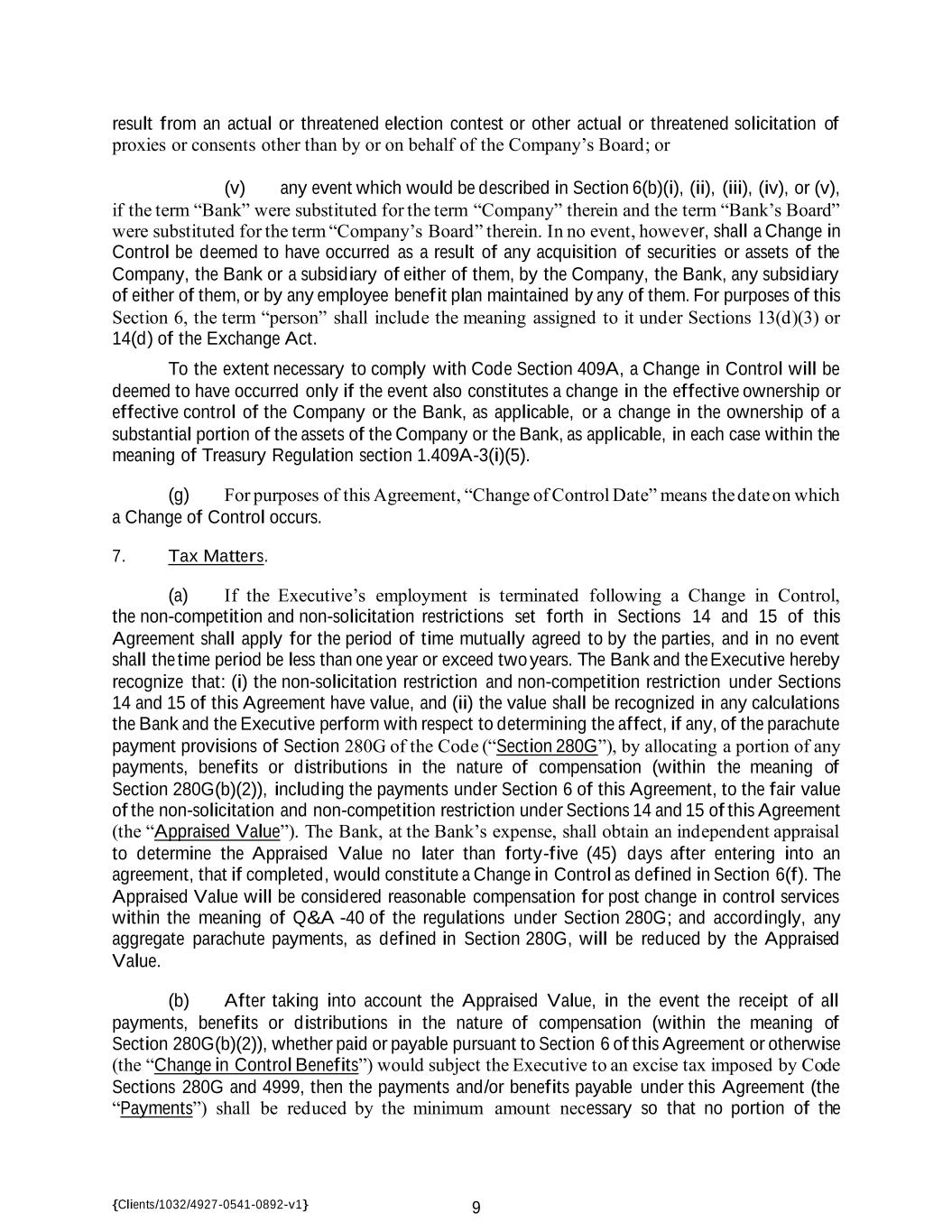 {Clients/1032/4927-0541-0892-v1} 9 result from an actual or threatened election contest or other actual or threatened solicitation of proxies or consents other than by or on behalf of the Company’s Board; or (v) any event which would be described in Section 6(b)(i), (ii), (iii), (iv), or (v), if the term “Bank” were substituted for the term “Company” therein and the term “Bank’s Board” were substituted for the term “Company’s Board” therein. In no event, however, shall a Change in Control be deemed to have occurred as a result of any acquisition of securities or assets of the Company, the Bank or a subsidiary of either of them, by the Company, the Bank, any subsidiary of either of them, or by any employee benefit plan maintained by any of them. For purposes of this Section 6, the term “person” shall include the meaning assigned to it under Sections 13(d)(3) or 14(d) of the Exchange Act. To the extent necessary to comply with Code Section 409A, a Change in Control will be deemed to have occurred only if the event also constitutes a change in the effective ownership or effective control of the Company or the Bank, as applicable, or a change in the ownership of a substantial portion of the assets of the Company or the Bank, as applicable, in each case within the meaning of Treasury Regulation section 1.409A-3(i)(5). (g) For purposes of this Agreement, “Change of Control Date” means the date on which a Change of Control occurs. 7. Tax Matters. (a) If the Executive’s employment is terminated following a Change in Control, the non-competition and non-solicitation restrictions set forth in Sections 14 and 15 of this Agreement shall apply for the period of time mutually agreed to by the parties, and in no event shall the time period be less than one year or exceed two years. The Bank and the Executive hereby recognize that: (i) the non-solicitation restriction and non-competition restriction under Sections 14 and 15 of this Agreement have value, and (ii) the value shall be recognized in any calculations the Bank and the Executive perform with respect to determining the affect, if any, of the parachute payment provisions of Section 280G of the Code (“Section 280G”), by allocating a portion of any payments, benefits or distributions in the nature of compensation (within the meaning of Section 280G(b)(2)), including the payments under Section 6 of this Agreement, to the fair value of the non-solicitation and non-competition restriction under Sections 14 and 15 of this Agreement (the “Appraised Value”). The Bank, at the Bank’s expense, shall obtain an independent appraisal to determine the Appraised Value no later than forty-five (45) days after entering into an agreement, that if completed, would constitute a Change in Control as defined in Section 6(f). The Appraised Value will be considered reasonable compensation for post change in control services within the meaning of Q&A -40 of the regulations under Section 280G; and accordingly, any aggregate parachute payments, as defined in Section 280G, will be reduced by the Appraised Value. (b) After taking into account the Appraised Value, in the event the receipt of all payments, benefits or distributions in the nature of compensation (within the meaning of Section 280G(b)(2)), whether paid or payable pursuant to Section 6 of this Agreement or otherwise (the “Change in Control Benefits”) would subject the Executive to an excise tax imposed by Code Sections 280G and 4999, then the payments and/or benefits payable under this Agreement (the “Payments”) shall be reduced by the minimum amount necessary so that no portion of the