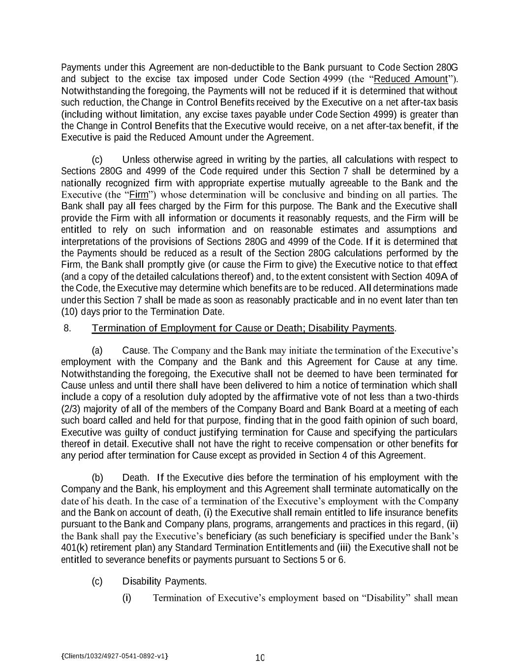 {Clients/1032/4927-0541-0892-v1} 10 Payments under this Agreement are non-deductible to the Bank pursuant to Code Section 280G and subject to the excise tax imposed under Code Section 4999 (the “Reduced Amount”). Notwithstanding the foregoing, the Payments will not be reduced if it is determined that without such reduction, the Change in Control Benefits received by the Executive on a net after-tax basis (including without limitation, any excise taxes payable under Code Section 4999) is greater than the Change in Control Benefits that the Executive would receive, on a net after-tax benefit, if the Executive is paid the Reduced Amount under the Agreement. (c) Unless otherwise agreed in writing by the parties, all calculations with respect to Sections 280G and 4999 of the Code required under this Section 7 shall be determined by a nationally recognized firm with appropriate expertise mutually agreeable to the Bank and the Executive (the “Firm”) whose determination will be conclusive and binding on all parties. The Bank shall pay all fees charged by the Firm for this purpose. The Bank and the Executive shall provide the Firm with all information or documents it reasonably requests, and the Firm will be entitled to rely on such information and on reasonable estimates and assumptions and interpretations of the provisions of Sections 280G and 4999 of the Code. If it is determined that the Payments should be reduced as a result of the Section 280G calculations performed by the Firm, the Bank shall promptly give (or cause the Firm to give) the Executive notice to that effect (and a copy of the detailed calculations thereof) and, to the extent consistent with Section 409A of the Code, the Executive may determine which benefits are to be reduced. All determinations made under this Section 7 shall be made as soon as reasonably practicable and in no event later than ten (10) days prior to the Termination Date. 8. Termination of Employment for Cause or Death; Disability Payments. (a) Cause. The Company and the Bank may initiate the termination of the Executive’s employment with the Company and the Bank and this Agreement for Cause at any time. Notwithstanding the foregoing, the Executive shall not be deemed to have been terminated for Cause unless and until there shall have been delivered to him a notice of termination which shall include a copy of a resolution duly adopted by the affirmative vote of not less than a two-thirds (2/3) majority of all of the members of the Company Board and Bank Board at a meeting of each such board called and held for that purpose, finding that in the good faith opinion of such board, Executive was guilty of conduct justifying termination for Cause and specifying the particulars thereof in detail. Executive shall not have the right to receive compensation or other benefits for any period after termination for Cause except as provided in Section 4 of this Agreement. (b) Death. If the Executive dies before the termination of his employment with the Company and the Bank, his employment and this Agreement shall terminate automatically on the date of his death. In the case of a termination of the Executive’s employment with the Company and the Bank on account of death, (i) the Executive shall remain entitled to life insurance benefits pursuant to the Bank and Company plans, programs, arrangements and practices in this regard, (ii) the Bank shall pay the Executive’s beneficiary (as such beneficiary is specified under the Bank’s 401(k) retirement plan) any Standard Termination Entitlements and (iii) the Executive shall not be entitled to severance benefits or payments pursuant to Sections 5 or 6. (c) Disability Payments. (i) Termination of Executive’s employment based on “Disability” shall mean
