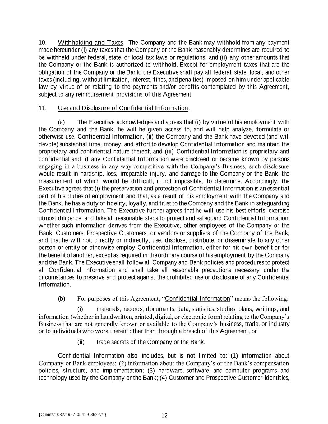 {Clients/1032/4927-0541-0892-v1} 12 10. Withholding and Taxes. The Company and the Bank may withhold from any payment made hereunder (i) any taxes that the Company or the Bank reasonably determines are required to be withheld under federal, state, or local tax laws or regulations, and (ii) any other amounts that the Company or the Bank is authorized to withhold. Except for employment taxes that are the obligation of the Company or the Bank, the Executive shall pay all federal, state, local, and other taxes (including, without limitation, interest, fines, and penalties) imposed on him under applicable law by virtue of or relating to the payments and/or benefits contemplated by this Agreement, subject to any reimbursement provisions of this Agreement. 11. Use and Disclosure of Confidential Information. (a) The Executive acknowledges and agrees that (i) by virtue of his employment with the Company and the Bank, he will be given access to, and will help analyze, formulate or otherwise use, Confidential Information, (ii) the Company and the Bank have devoted (and will devote) substantial time, money, and effort to develop Confidential Information and maintain the proprietary and confidential nature thereof, and (iii) Confidential Information is proprietary and confidential and, if any Confidential Information were disclosed or became known by persons engaging in a business in any way competitive with the Company’s Business, such disclosure would result in hardship, loss, irreparable injury, and damage to the Company or the Bank, the measurement of which would be difficult, if not impossible, to determine. Accordingly, the Executive agrees that (i) the preservation and protection of Confidential Information is an essential part of his duties of employment and that, as a result of his employment with the Company and the Bank, he has a duty of fidelity, loyalty, and trust to the Company and the Bank in safeguarding Confidential Information. The Executive further agrees that he will use his best efforts, exercise utmost diligence, and take all reasonable steps to protect and safeguard Confidential Information, whether such information derives from the Executive, other employees of the Company or the Bank, Customers, Prospective Customers, or vendors or suppliers of the Company of the Bank, and that he will not, directly or indirectly, use, disclose, distribute, or disseminate to any other person or entity or otherwise employ Confidential Information, either for his own benefit or for the benefit of another, except as required in the ordinary course of his employment by the Company and the Bank. The Executive shall follow all Company and Bank policies and procedures to protect all Confidential Information and shall take all reasonable precautions necessary under the circumstances to preserve and protect against the prohibited use or disclosure of any Confidential Information. (b) For purposes of this Agreement, “Confidential Information” means the following: (i) materials, records, documents, data, statistics, studies, plans, writings, and information (whether in handwritten, printed, digital, or electronic form) relating to the Company’s Business that are not generally known or available to the Company’s business, trade, or industry or to individuals who work therein other than through a breach of this Agreement, or (ii) trade secrets of the Company or the Bank. Confidential Information also includes, but is not limited to: (1) information about Company or Bank employees; (2) information about the Company’s or the Bank’s compensation policies, structure, and implementation; (3) hardware, software, and computer programs and technology used by the Company or the Bank; (4) Customer and Prospective Customer identities,