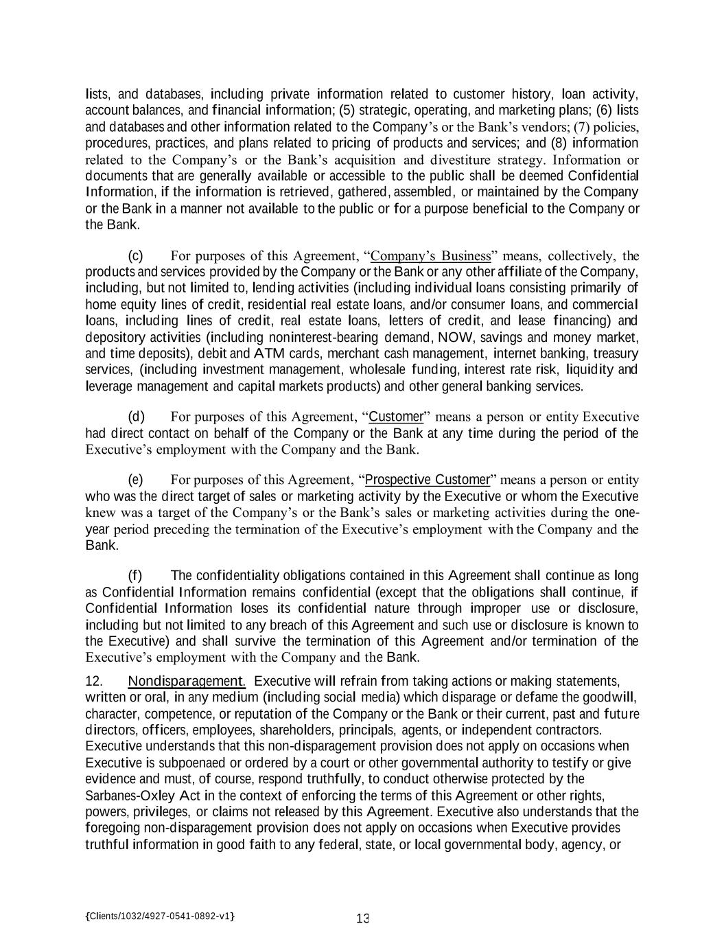 {Clients/1032/4927-0541-0892-v1} 13 lists, and databases, including private information related to customer history, loan activity, account balances, and financial information; (5) strategic, operating, and marketing plans; (6) lists and databases and other information related to the Company’s or the Bank’s vendors; (7) policies, procedures, practices, and plans related to pricing of products and services; and (8) information related to the Company’s or the Bank’s acquisition and divestiture strategy. Information or documents that are generally available or accessible to the public shall be deemed Confidential Information, if the information is retrieved, gathered, assembled, or maintained by the Company or the Bank in a manner not available to the public or for a purpose beneficial to the Company or the Bank. (c) For purposes of this Agreement, “Company’s Business” means, collectively, the products and services provided by the Company or the Bank or any other affiliate of the Company, including, but not limited to, lending activities (including individual loans consisting primarily of home equity lines of credit, residential real estate loans, and/or consumer loans, and commercial loans, including lines of credit, real estate loans, letters of credit, and lease financing) and depository activities (including noninterest-bearing demand, NOW, savings and money market, and time deposits), debit and ATM cards, merchant cash management, internet banking, treasury services, (including investment management, wholesale funding, interest rate risk, liquidity and leverage management and capital markets products) and other general banking services. (d) For purposes of this Agreement, “Customer” means a person or entity Executive had direct contact on behalf of the Company or the Bank at any time during the period of the Executive’s employment with the Company and the Bank. (e) For purposes of this Agreement, “Prospective Customer” means a person or entity who was the direct target of sales or marketing activity by the Executive or whom the Executive knew was a target of the Company’s or the Bank’s sales or marketing activities during the one- year period preceding the termination of the Executive’s employment with the Company and the Bank. (f) The confidentiality obligations contained in this Agreement shall continue as long as Confidential Information remains confidential (except that the obligations shall continue, if Confidential Information loses its confidential nature through improper use or disclosure, including but not limited to any breach of this Agreement and such use or disclosure is known to the Executive) and shall survive the termination of this Agreement and/or termination of the Executive’s employment with the Company and the Bank. 12. Nondisparagement. Executive will refrain from taking actions or making statements, written or oral, in any medium (including social media) which disparage or defame the goodwill, character, competence, or reputation of the Company or the Bank or their current, past and future directors, officers, employees, shareholders, principals, agents, or independent contractors. Executive understands that this non-disparagement provision does not apply on occasions when Executive is subpoenaed or ordered by a court or other governmental authority to testify or give evidence and must, of course, respond truthfully, to conduct otherwise protected by the Sarbanes-Oxley Act in the context of enforcing the terms of this Agreement or other rights, powers, privileges, or claims not released by this Agreement. Executive also understands that the foregoing non-disparagement provision does not apply on occasions when Executive provides truthful information in good faith to any federal, state, or local governmental body, agency, or