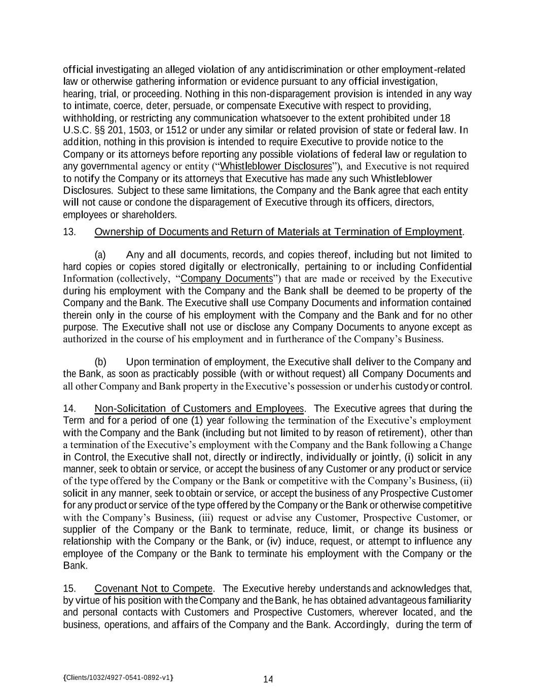 {Clients/1032/4927-0541-0892-v1} 14 official investigating an alleged violation of any antidiscrimination or other employment-related law or otherwise gathering information or evidence pursuant to any official investigation, hearing, trial, or proceeding. Nothing in this non-disparagement provision is intended in any way to intimate, coerce, deter, persuade, or compensate Executive with respect to providing, withholding, or restricting any communication whatsoever to the extent prohibited under 18 U.S.C. §§ 201, 1503, or 1512 or under any similar or related provision of state or federal law. In addition, nothing in this provision is intended to require Executive to provide notice to the Company or its attorneys before reporting any possible violations of federal law or regulation to any governmental agency or entity (“Whistleblower Disclosures”), and Executive is not required to notify the Company or its attorneys that Executive has made any such Whistleblower Disclosures. Subject to these same limitations, the Company and the Bank agree that each entity will not cause or condone the disparagement of Executive through its officers, directors, employees or shareholders. 13. Ownership of Documents and Return of Materials at Termination of Employment. (a) Any and all documents, records, and copies thereof, including but not limited to hard copies or copies stored digitally or electronically, pertaining to or including Confidential Information (collectively, “Company Documents”) that are made or received by the Executive during his employment with the Company and the Bank shall be deemed to be property of the Company and the Bank. The Executive shall use Company Documents and information contained therein only in the course of his employment with the Company and the Bank and for no other purpose. The Executive shall not use or disclose any Company Documents to anyone except as authorized in the course of his employment and in furtherance of the Company’s Business. (b) Upon termination of employment, the Executive shall deliver to the Company and the Bank, as soon as practicably possible (with or without request) all Company Documents and all other Company and Bank property in the Executive’s possession or under his custody or control. 14. Non-Solicitation of Customers and Employees. The Executive agrees that during the Term and for a period of one (1) year following the termination of the Executive’s employment with the Company and the Bank (including but not limited to by reason of retirement), other than a termination of the Executive’s employment with the Company and the Bank following a Change in Control, the Executive shall not, directly or indirectly, individually or jointly, (i) solicit in any manner, seek to obtain or service, or accept the business of any Customer or any product or service of the type offered by the Company or the Bank or competitive with the Company’s Business, (ii) solicit in any manner, seek to obtain or service, or accept the business of any Prospective Customer for any product or service of the type offered by the Company or the Bank or otherwise competitive with the Company’s Business, (iii) request or advise any Customer, Prospective Customer, or supplier of the Company or the Bank to terminate, reduce, limit, or change its business or relationship with the Company or the Bank, or (iv) induce, request, or attempt to influence any employee of the Company or the Bank to terminate his employment with the Company or the Bank. 15. Covenant Not to Compete. The Executive hereby understands and acknowledges that, by virtue of his position with the Company and the Bank, he has obtained advantageous familiarity and personal contacts with Customers and Prospective Customers, wherever located, and the business, operations, and affairs of the Company and the Bank. Accordingly, during the term of