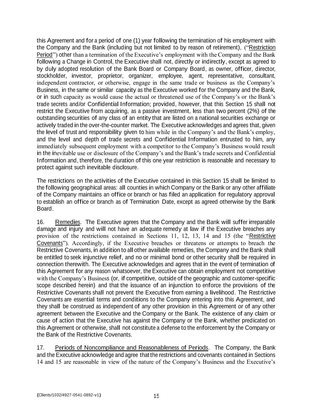 {Clients/1032/4927-0541-0892-v1} 15 this Agreement and for a period of one (1) year following the termination of his employment with the Company and the Bank (including but not limited to by reason of retirement), (“Restriction Period”) other than a termination of the Executive’s employment with the Company and the Bank following a Change in Control, the Executive shall not, directly or indirectly, except as agreed to by duly adopted resolution of the Bank Board or Company Board, as owner, officer, director, stockholder, investor, proprietor, organizer, employee, agent, representative, consultant, independent contractor, or otherwise, engage in the same trade or business as the Company’s Business, in the same or similar capacity as the Executive worked for the Company and the Bank, or in such capacity as would cause the actual or threatened use of the Company’s or the Bank’s trade secrets and/or Confidential Information; provided, however, that this Section 15 shall not restrict the Executive from acquiring, as a passive investment, less than two percent (2%) of the outstanding securities of any class of an entity that are listed on a national securities exchange or actively traded in the over-the-counter market. The Executive acknowledges and agrees that, given the level of trust and responsibility given to him while in the Company’s and the Bank’s employ, and the level and depth of trade secrets and Confidential Information entrusted to him, any immediately subsequent employment with a competitor to the Company’s Business would result in the inevitable use or disclosure of the Company’s and the Bank’s trade secrets and Confidential Information and, therefore, the duration of this one year restriction is reasonable and necessary to protect against such inevitable disclosure. The restrictions on the activities of the Executive contained in this Section 15 shall be limited to the following geographical areas: all counties in which Company or the Bank or any other affiliate of the Company maintains an office or branch or has filed an application for regulatory approval to establish an office or branch as of Termination Date, except as agreed otherwise by the Bank Board. 16. Remedies. The Executive agrees that the Company and the Bank will suffer irreparable damage and injury and will not have an adequate remedy at law if the Executive breaches any provision of the restrictions contained in Sections 11, 12, 13, 14 and 15 (the “Restrictive Covenants”). Accordingly, if the Executive breaches or threatens or attempts to breach the Restrictive Covenants, in addition to all other available remedies, the Company and the Bank shall be entitled to seek injunctive relief, and no or minimal bond or other security shall be required in connection therewith. The Executive acknowledges and agrees that in the event of termination of this Agreement for any reason whatsoever, the Executive can obtain employment not competitive with the Company’s Business (or, if competitive, outside of the geographic and customer-specific scope described herein) and that the issuance of an injunction to enforce the provisions of the Restrictive Covenants shall not prevent the Executive from earning a livelihood. The Restrictive Covenants are essential terms and conditions to the Company entering into this Agreement, and they shall be construed as independent of any other provision in this Agreement or of any other agreement between the Executive and the Company or the Bank. The existence of any claim or cause of action that the Executive has against the Company or the Bank, whether predicated on this Agreement or otherwise, shall not constitute a defense to the enforcement by the Company or the Bank of the Restrictive Covenants. 17. Periods of Noncompliance and Reasonableness of Periods. The Company, the Bank and the Executive acknowledge and agree that the restrictions and covenants contained in Sections 14 and 15 are reasonable in view of the nature of the Company’s Business and the Executive’s