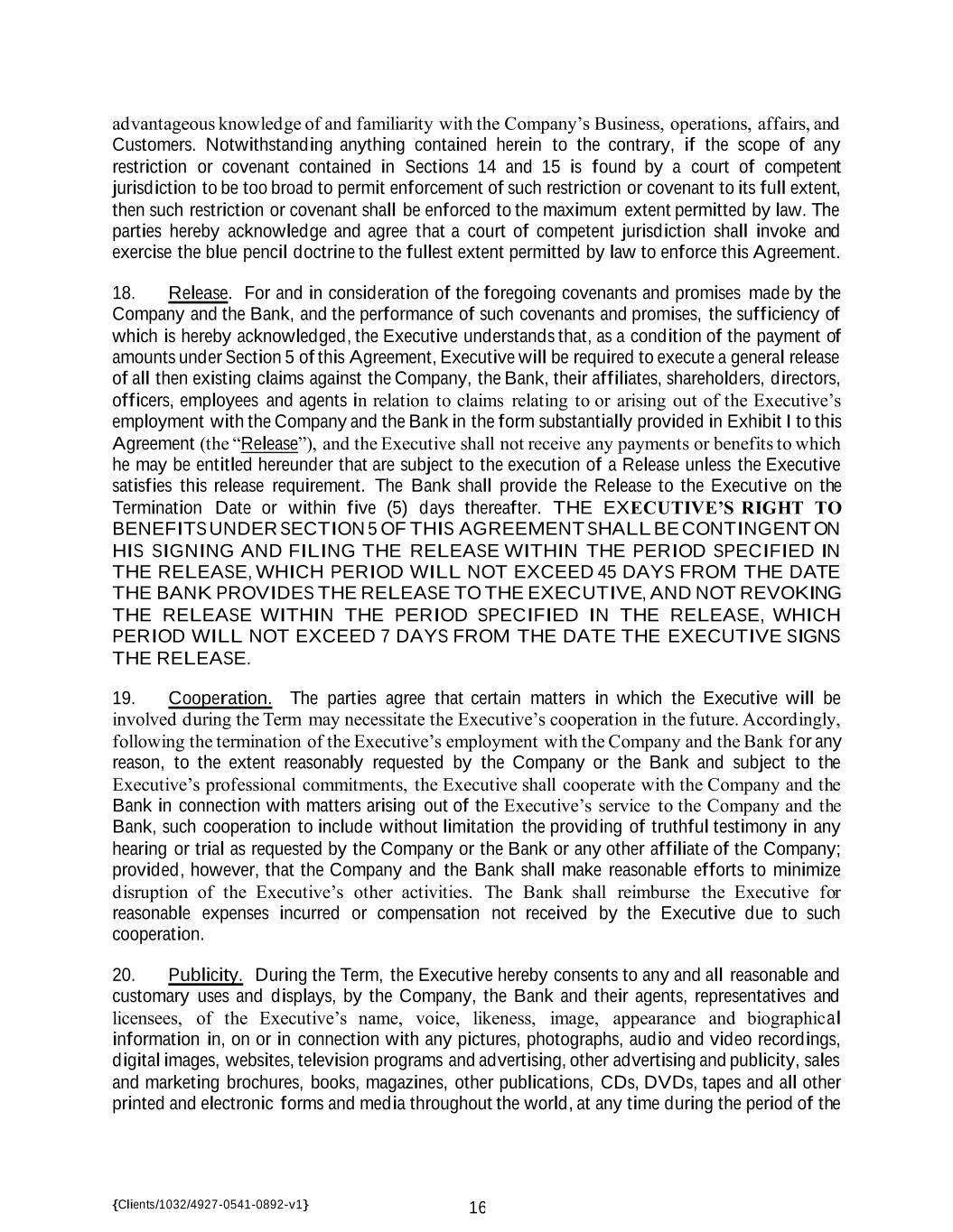 {Clients/1032/4927-0541-0892-v1} 16 advantageous knowledge of and familiarity with the Company’s Business, operations, affairs, and Customers. Notwithstanding anything contained herein to the contrary, if the scope of any restriction or covenant contained in Sections 14 and 15 is found by a court of competent jurisdiction to be too broad to permit enforcement of such restriction or covenant to its full extent, then such restriction or covenant shall be enforced to the maximum extent permitted by law. The parties hereby acknowledge and agree that a court of competent jurisdiction shall invoke and exercise the blue pencil doctrine to the fullest extent permitted by law to enforce this Agreement. 18. Release. For and in consideration of the foregoing covenants and promises made by the Company and the Bank, and the performance of such covenants and promises, the sufficiency of which is hereby acknowledged, the Executive understands that, as a condition of the payment of amounts under Section 5 of this Agreement, Executive will be required to execute a general release of all then existing claims against the Company, the Bank, their affiliates, shareholders, directors, officers, employees and agents in relation to claims relating to or arising out of the Executive’s employment with the Company and the Bank in the form substantially provided in Exhibit I to this Agreement (the “Release”), and the Executive shall not receive any payments or benefits to which he may be entitled hereunder that are subject to the execution of a Release unless the Executive satisfies this release requirement. The Bank shall provide the Release to the Executive on the Termination Date or within five (5) days thereafter. THE EXECUTIVE’S RIGHT TO BENEFITS UNDER SECTION 5 OF THIS AGREEMENT SHALL BE CONTINGENT ON HIS SIGNING AND FILING THE RELEASE WITHIN THE PERIOD SPECIFIED IN THE RELEASE, WHICH PERIOD WILL NOT EXCEED 45 DAYS FROM THE DATE THE BANK PROVIDES THE RELEASE TO THE EXECUTIVE, AND NOT REVOKING THE RELEASE WITHIN THE PERIOD SPECIFIED IN THE RELEASE, WHICH PERIOD WILL NOT EXCEED 7 DAYS FROM THE DATE THE EXECUTIVE SIGNS THE RELEASE. 19. Cooperation. The parties agree that certain matters in which the Executive will be involved during the Term may necessitate the Executive’s cooperation in the future. Accordingly, following the termination of the Executive’s employment with the Company and the Bank for any reason, to the extent reasonably requested by the Company or the Bank and subject to the Executive’s professional commitments, the Executive shall cooperate with the Company and the Bank in connection with matters arising out of the Executive’s service to the Company and the Bank, such cooperation to include without limitation the providing of truthful testimony in any hearing or trial as requested by the Company or the Bank or any other affiliate of the Company; provided, however, that the Company and the Bank shall make reasonable efforts to minimize disruption of the Executive’s other activities. The Bank shall reimburse the Executive for reasonable expenses incurred or compensation not received by the Executive due to such cooperation. 20. Publicity. During the Term, the Executive hereby consents to any and all reasonable and customary uses and displays, by the Company, the Bank and their agents, representatives and licensees, of the Executive’s name, voice, likeness, image, appearance and biographical information in, on or in connection with any pictures, photographs, audio and video recordings, digital images, websites, television programs and advertising, other advertising and publicity, sales and marketing brochures, books, magazines, other publications, CDs, DVDs, tapes and all other printed and electronic forms and media throughout the world, at any time during the period of the