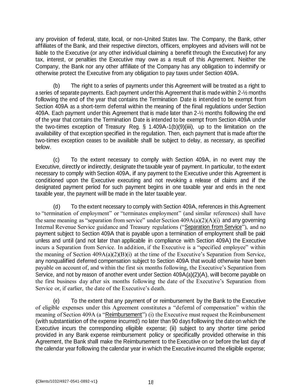 {Clients/1032/4927-0541-0892-v1} 18 any provision of federal, state, local, or non-United States law. The Company, the Bank, other affiliates of the Bank, and their respective directors, officers, employees and advisers will not be liable to the Executive (or any other individual claiming a benefit through the Executive) for any tax, interest, or penalties the Executive may owe as a result of this Agreement. Neither the Company, the Bank nor any other affiliate of the Company has any obligation to indemnify or otherwise protect the Executive from any obligation to pay taxes under Section 409A. (b) The right to a series of payments under this Agreement will be treated as a right to a series of separate payments. Each payment under this Agreement that is made within 2-½ months following the end of the year that contains the Termination Date is intended to be exempt from Section 409A as a short-term deferral within the meaning of the final regulations under Section 409A. Each payment under this Agreement that is made later than 2-½ months following the end of the year that contains the Termination Date is intended to be exempt from Section 409A under the two-times exception of Treasury Reg. § 1.409A-1(b)(9)(iii), up to the limitation on the availability of that exception specified in the regulation. Then, each payment that is made after the two-times exception ceases to be available shall be subject to delay, as necessary, as specified below. (c) To the extent necessary to comply with Section 409A, in no event may the Executive, directly or indirectly, designate the taxable year of payment. In particular, to the extent necessary to comply with Section 409A, if any payment to the Executive under this Agreement is conditioned upon the Executive executing and not revoking a release of claims and if the designated payment period for such payment begins in one taxable year and ends in the next taxable year, the payment will be made in the later taxable year. (d) To the extent necessary to comply with Section 409A, references in this Agreement to “termination of employment” or “terminates employment” (and similar references) shall have the same meaning as “separation from service” under Section 409A(a)(2)(A)(i) and any governing Internal Revenue Service guidance and Treasury regulations (“Separation from Service”), and no payment subject to Section 409A that is payable upon a termination of employment shall be paid unless and until (and not later than applicable in compliance with Section 409A) the Executive incurs a Separation from Service. In addition, if the Executive is a “specified employee” within the meaning of Section 409A(a)(2)(B)(i) at the time of the Executive’s Separation from Service, any nonqualified deferred compensation subject to Section 409A that would otherwise have been payable on account of, and within the first six months following, the Executive’s Separation from Service, and not by reason of another event under Section 409A(a)(2)(A), will become payable on the first business day after six months following the date of the Executive’s Separation from Service or, if earlier, the date of the Executive’s death. (e) To the extent that any payment of or reimbursement by the Bank to the Executive of eligible expenses under this Agreement constitutes a “deferral of compensation” within the meaning of Section 409A (a “Reimbursement”) (i) the Executive must request the Reimbursement (with substantiation of the expense incurred) no later than 90 days following the date on which the Executive incurs the corresponding eligible expense; (ii) subject to any shorter time period provided in any Bank expense reimbursement policy or specifically provided otherwise in this Agreement, the Bank shall make the Reimbursement to the Executive on or before the last day of the calendar year following the calendar year in which the Executive incurred the eligible expense;
