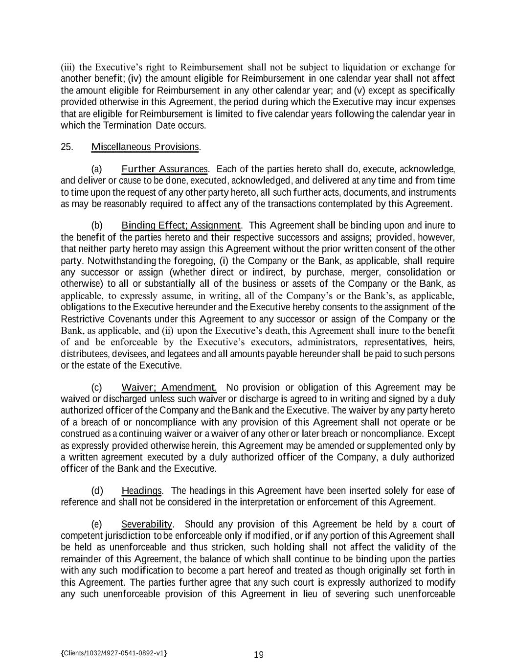 {Clients/1032/4927-0541-0892-v1} 19 (iii) the Executive’s right to Reimbursement shall not be subject to liquidation or exchange for another benefit; (iv) the amount eligible for Reimbursement in one calendar year shall not affect the amount eligible for Reimbursement in any other calendar year; and (v) except as specifically provided otherwise in this Agreement, the period during which the Executive may incur expenses that are eligible for Reimbursement is limited to five calendar years following the calendar year in which the Termination Date occurs. 25. Miscellaneous Provisions. (a) Further Assurances. Each of the parties hereto shall do, execute, acknowledge, and deliver or cause to be done, executed, acknowledged, and delivered at any time and from time to time upon the request of any other party hereto, all such further acts, documents, and instruments as may be reasonably required to affect any of the transactions contemplated by this Agreement. (b) Binding Effect; Assignment. This Agreement shall be binding upon and inure to the benefit of the parties hereto and their respective successors and assigns; provided, however, that neither party hereto may assign this Agreement without the prior written consent of the other party. Notwithstanding the foregoing, (i) the Company or the Bank, as applicable, shall require any successor or assign (whether direct or indirect, by purchase, merger, consolidation or otherwise) to all or substantially all of the business or assets of the Company or the Bank, as applicable, to expressly assume, in writing, all of the Company’s or the Bank’s, as applicable, obligations to the Executive hereunder and the Executive hereby consents to the assignment of the Restrictive Covenants under this Agreement to any successor or assign of the Company or the Bank, as applicable, and (ii) upon the Executive’s death, this Agreement shall inure to the benefit of and be enforceable by the Executive’s executors, administrators, representatives, heirs, distributees, devisees, and legatees and all amounts payable hereunder shall be paid to such persons or the estate of the Executive. (c) Waiver; Amendment. No provision or obligation of this Agreement may be waived or discharged unless such waiver or discharge is agreed to in writing and signed by a duly authorized officer of the Company and the Bank and the Executive. The waiver by any party hereto of a breach of or noncompliance with any provision of this Agreement shall not operate or be construed as a continuing waiver or a waiver of any other or later breach or noncompliance. Except as expressly provided otherwise herein, this Agreement may be amended or supplemented only by a written agreement executed by a duly authorized officer of the Company, a duly authorized officer of the Bank and the Executive. (d) Headings. The headings in this Agreement have been inserted solely for ease of reference and shall not be considered in the interpretation or enforcement of this Agreement. (e) Severability. Should any provision of this Agreement be held by a court of competent jurisdiction to be enforceable only if modified, or if any portion of this Agreement shall be held as unenforceable and thus stricken, such holding shall not affect the validity of the remainder of this Agreement, the balance of which shall continue to be binding upon the parties with any such modification to become a part hereof and treated as though originally set forth in this Agreement. The parties further agree that any such court is expressly authorized to modify any such unenforceable provision of this Agreement in lieu of severing such unenforceable