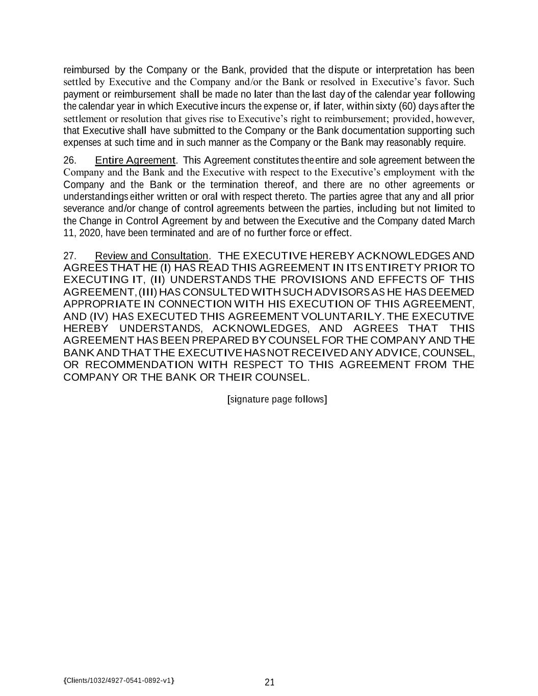 {Clients/1032/4927-0541-0892-v1} 21 reimbursed by the Company or the Bank, provided that the dispute or interpretation has been settled by Executive and the Company and/or the Bank or resolved in Executive’s favor. Such payment or reimbursement shall be made no later than the last day of the calendar year following the calendar year in which Executive incurs the expense or, if later, within sixty (60) days after the settlement or resolution that gives rise to Executive’s right to reimbursement; provided, however, that Executive shall have submitted to the Company or the Bank documentation supporting such expenses at such time and in such manner as the Company or the Bank may reasonably require. 26. Entire Agreement. This Agreement constitutes the entire and sole agreement between the Company and the Bank and the Executive with respect to the Executive’s employment with the Company and the Bank or the termination thereof, and there are no other agreements or understandings either written or oral with respect thereto. The parties agree that any and all prior severance and/or change of control agreements between the parties, including but not limited to the Change in Control Agreement by and between the Executive and the Company dated March 11, 2020, have been terminated and are of no further force or effect. 27. Review and Consultation. THE EXECUTIVE HEREBY ACKNOWLEDGES AND AGREES THAT HE (I) HAS READ THIS AGREEMENT IN ITS ENTIRETY PRIOR TO EXECUTING IT, (II) UNDERSTANDS THE PROVISIONS AND EFFECTS OF THIS AGREEMENT, (III) HAS CONSULTED WITH SUCH ADVISORS AS HE HAS DEEMED APPROPRIATE IN CONNECTION WITH HIS EXECUTION OF THIS AGREEMENT, AND (IV) HAS EXECUTED THIS AGREEMENT VOLUNTARILY. THE EXECUTIVE HEREBY UNDERSTANDS, ACKNOWLEDGES, AND AGREES THAT THIS AGREEMENT HAS BEEN PREPARED BY COUNSEL FOR THE COMPANY AND THE BANK AND THAT THE EXECUTIVE HAS NOT RECEIVED ANY ADVICE, COUNSEL, OR RECOMMENDATION WITH RESPECT TO THIS AGREEMENT FROM THE COMPANY OR THE BANK OR THEIR COUNSEL. [signature page follows]