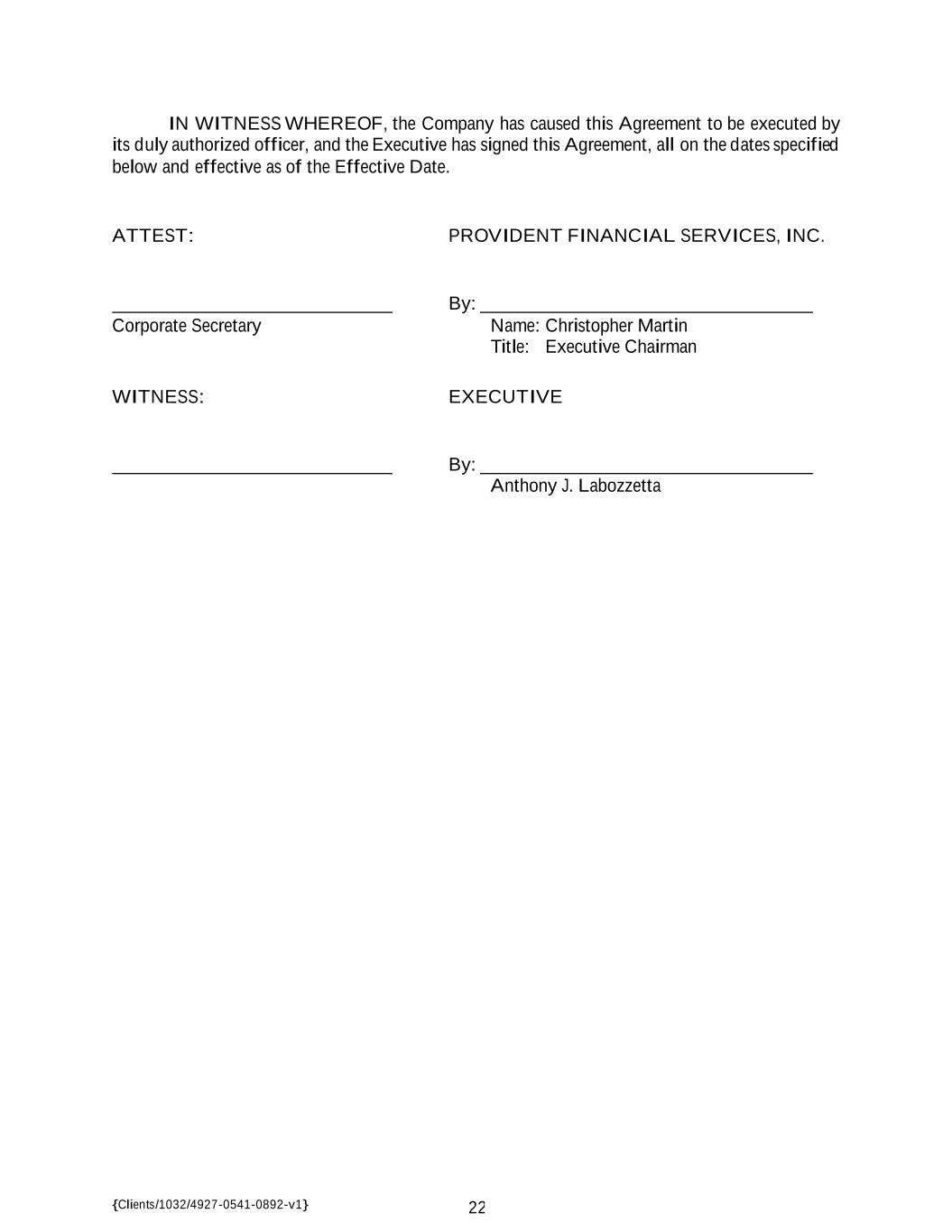 {Clients/1032/4927-0541-0892-v1} 22 IN WITNESS WHEREOF, the Company has caused this Agreement to be executed by its duly authorized officer, and the Executive has signed this Agreement, all on the dates specified below and effective as of the Effective Date. ATTEST: PROVIDENT FINANCIAL SERVICES, INC. By: Corporate Secretary Name: Christopher Martin Title: Executive Chairman WITNESS: EXECUTIVE By: Anthony J. Labozzetta