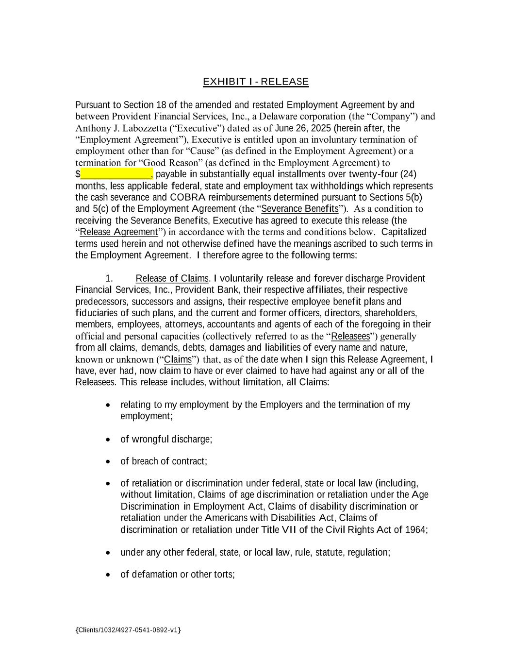 {Clients/1032/4927-0541-0892-v1} EXHIBIT I - RELEASE Pursuant to Section 18 of the amended and restated Employment Agreement by and between Provident Financial Services, Inc., a Delaware corporation (the “Company”) and Anthony J. Labozzetta (“Executive”) dated as of June 26, 2025 (herein after, the “Employment Agreement”), Executive is entitled upon an involuntary termination of employment other than for “Cause” (as defined in the Employment Agreement) or a termination for “Good Reason” (as defined in the Employment Agreement) to $______________, payable in substantially equal installments over twenty-four (24) months, less applicable federal, state and employment tax withholdings which represents the cash severance and COBRA reimbursements determined pursuant to Sections 5(b) and 5(c) of the Employment Agreement (the “Severance Benefits”). As a condition to receiving the Severance Benefits, Executive has agreed to execute this release (the “Release Agreement”) in accordance with the terms and conditions below. Capitalized terms used herein and not otherwise defined have the meanings ascribed to such terms in the Employment Agreement. I therefore agree to the following terms: 1. Release of Claims. I voluntarily release and forever discharge Provident Financial Services, Inc., Provident Bank, their respective affiliates, their respective predecessors, successors and assigns, their respective employee benefit plans and fiduciaries of such plans, and the current and former officers, directors, shareholders, members, employees, attorneys, accountants and agents of each of the foregoing in their official and personal capacities (collectively referred to as the “Releasees”) generally from all claims, demands, debts, damages and liabilities of every name and nature, known or unknown (“Claims”) that, as of the date when I sign this Release Agreement, I have, ever had, now claim to have or ever claimed to have had against any or all of the Releasees. This release includes, without limitation, all Claims: • relating to my employment by the Employers and the termination of my employment; • of wrongful discharge; • of breach of contract; • of retaliation or discrimination under federal, state or local law (including, without limitation, Claims of age discrimination or retaliation under the Age Discrimination in Employment Act, Claims of disability discrimination or retaliation under the Americans with Disabilities Act, Claims of discrimination or retaliation under Title VII of the Civil Rights Act of 1964; • under any other federal, state, or local law, rule, statute, regulation; • of defamation or other torts;