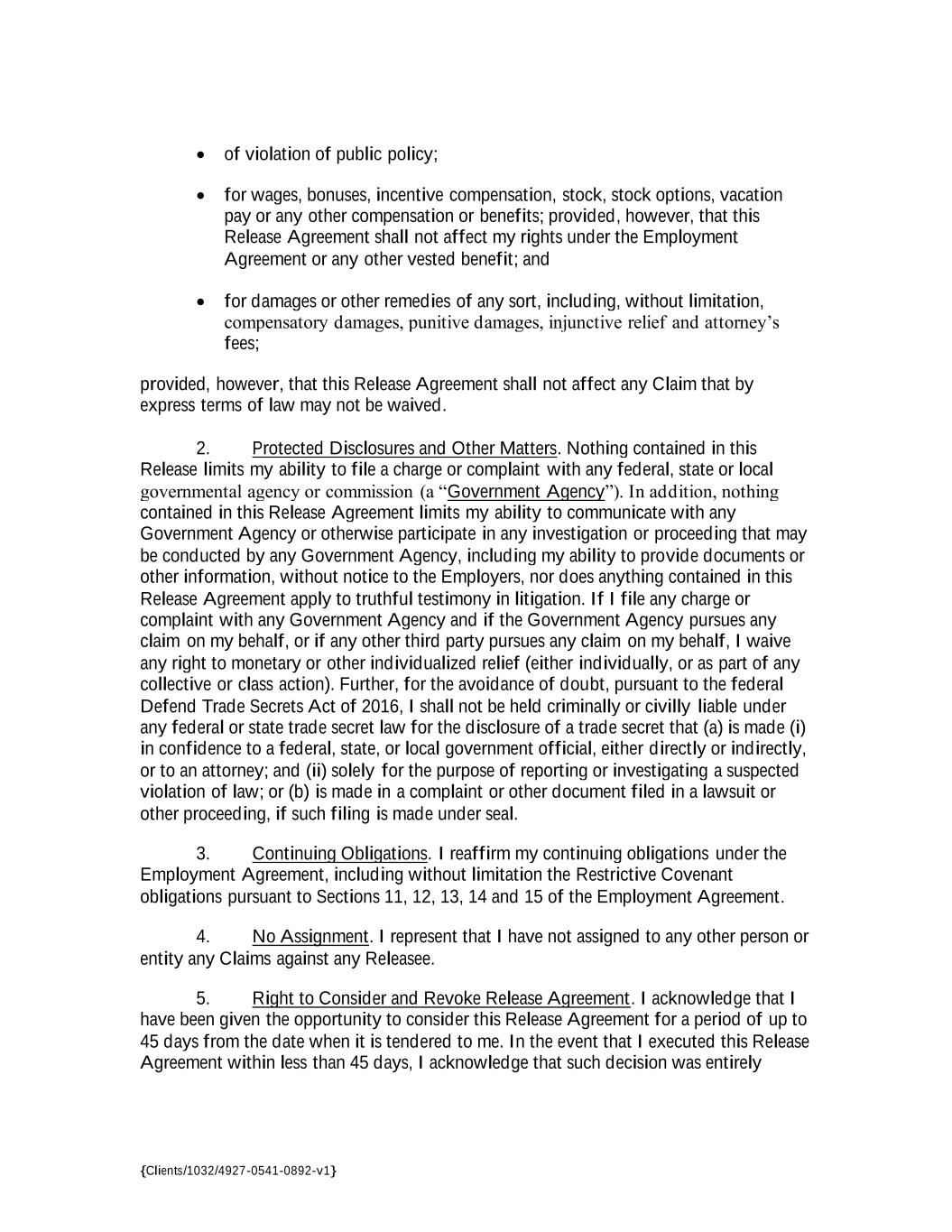 {Clients/1032/4927-0541-0892-v1} • of violation of public policy; • for wages, bonuses, incentive compensation, stock, stock options, vacation pay or any other compensation or benefits; provided, however, that this Release Agreement shall not affect my rights under the Employment Agreement or any other vested benefit; and • for damages or other remedies of any sort, including, without limitation, compensatory damages, punitive damages, injunctive relief and attorney’s fees; provided, however, that this Release Agreement shall not affect any Claim that by express terms of law may not be waived. 2. Protected Disclosures and Other Matters. Nothing contained in this Release limits my ability to file a charge or complaint with any federal, state or local governmental agency or commission (a “Government Agency”). In addition, nothing contained in this Release Agreement limits my ability to communicate with any Government Agency or otherwise participate in any investigation or proceeding that may be conducted by any Government Agency, including my ability to provide documents or other information, without notice to the Employers, nor does anything contained in this Release Agreement apply to truthful testimony in litigation. If I file any charge or complaint with any Government Agency and if the Government Agency pursues any claim on my behalf, or if any other third party pursues any claim on my behalf, I waive any right to monetary or other individualized relief (either individually, or as part of any collective or class action). Further, for the avoidance of doubt, pursuant to the federal Defend Trade Secrets Act of 2016, I shall not be held criminally or civilly liable under any federal or state trade secret law for the disclosure of a trade secret that (a) is made (i) in confidence to a federal, state, or local government official, either directly or indirectly, or to an attorney; and (ii) solely for the purpose of reporting or investigating a suspected violation of law; or (b) is made in a complaint or other document filed in a lawsuit or other proceeding, if such filing is made under seal. 3. Continuing Obligations. I reaffirm my continuing obligations under the Employment Agreement, including without limitation the Restrictive Covenant obligations pursuant to Sections 11, 12, 13, 14 and 15 of the Employment Agreement. 4. No Assignment. I represent that I have not assigned to any other person or entity any Claims against any Releasee. 5. Right to Consider and Revoke Release Agreement. I acknowledge that I have been given the opportunity to consider this Release Agreement for a period of up to 45 days from the date when it is tendered to me. In the event that I executed this Release Agreement within less than 45 days, I acknowledge that such decision was entirely