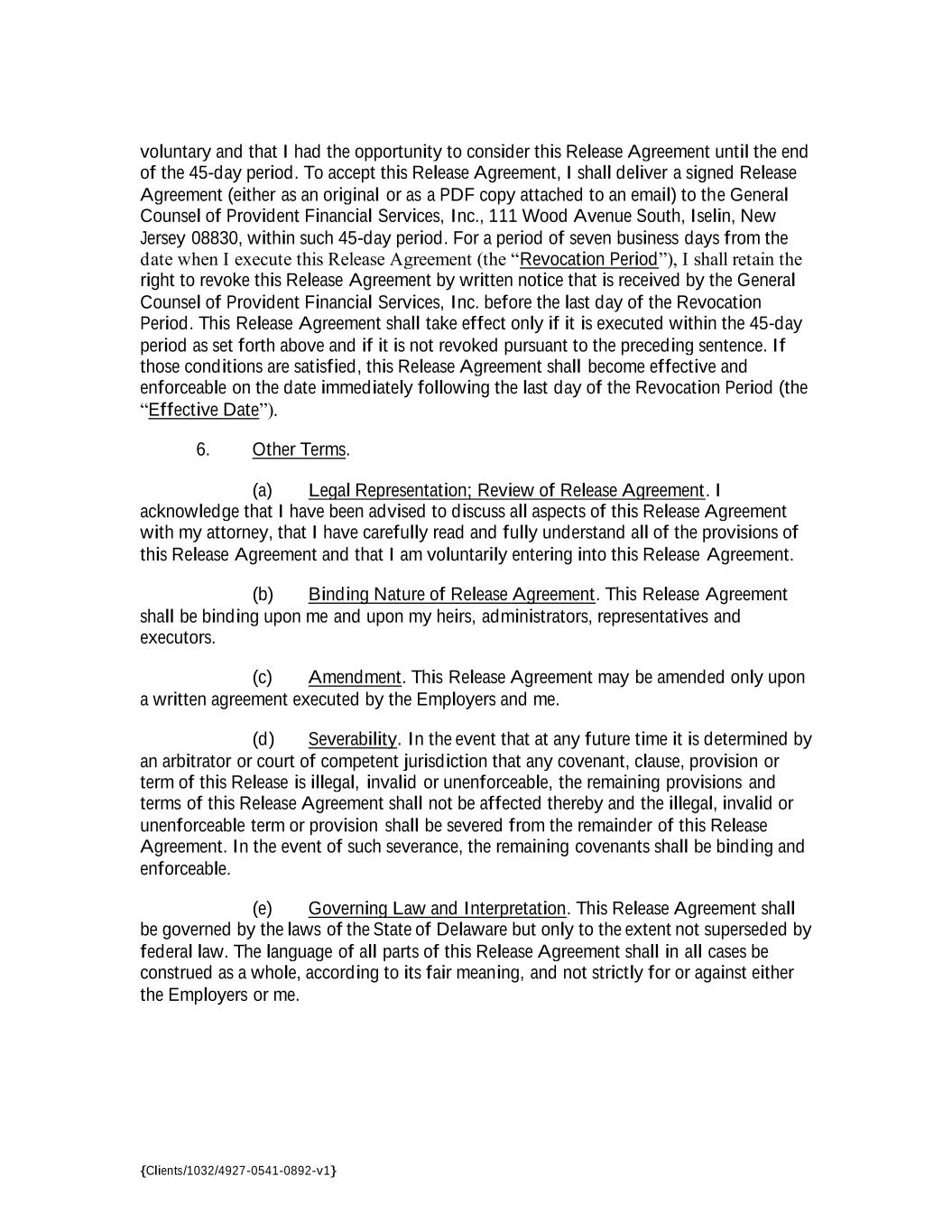 {Clients/1032/4927-0541-0892-v1} voluntary and that I had the opportunity to consider this Release Agreement until the end of the 45-day period. To accept this Release Agreement, I shall deliver a signed Release Agreement (either as an original or as a PDF copy attached to an email) to the General Counsel of Provident Financial Services, Inc., 111 Wood Avenue South, Iselin, New Jersey 08830, within such 45-day period. For a period of seven business days from the date when I execute this Release Agreement (the “Revocation Period”), I shall retain the right to revoke this Release Agreement by written notice that is received by the General Counsel of Provident Financial Services, Inc. before the last day of the Revocation Period. This Release Agreement shall take effect only if it is executed within the 45-day period as set forth above and if it is not revoked pursuant to the preceding sentence. If those conditions are satisfied, this Release Agreement shall become effective and enforceable on the date immediately following the last day of the Revocation Period (the “Effective Date”). 6. Other Terms. (a) Legal Representation; Review of Release Agreement. I acknowledge that I have been advised to discuss all aspects of this Release Agreement with my attorney, that I have carefully read and fully understand all of the provisions of this Release Agreement and that I am voluntarily entering into this Release Agreement. (b) Binding Nature of Release Agreement. This Release Agreement shall be binding upon me and upon my heirs, administrators, representatives and executors. (c) Amendment. This Release Agreement may be amended only upon a written agreement executed by the Employers and me. (d) Severability. In the event that at any future time it is determined by an arbitrator or court of competent jurisdiction that any covenant, clause, provision or term of this Release is illegal, invalid or unenforceable, the remaining provisions and terms of this Release Agreement shall not be affected thereby and the illegal, invalid or unenforceable term or provision shall be severed from the remainder of this Release Agreement. In the event of such severance, the remaining covenants shall be binding and enforceable. (e) Governing Law and Interpretation. This Release Agreement shall be governed by the laws of the State of Delaware but only to the extent not superseded by federal law. The language of all parts of this Release Agreement shall in all cases be construed as a whole, according to its fair meaning, and not strictly for or against either the Employers or me.