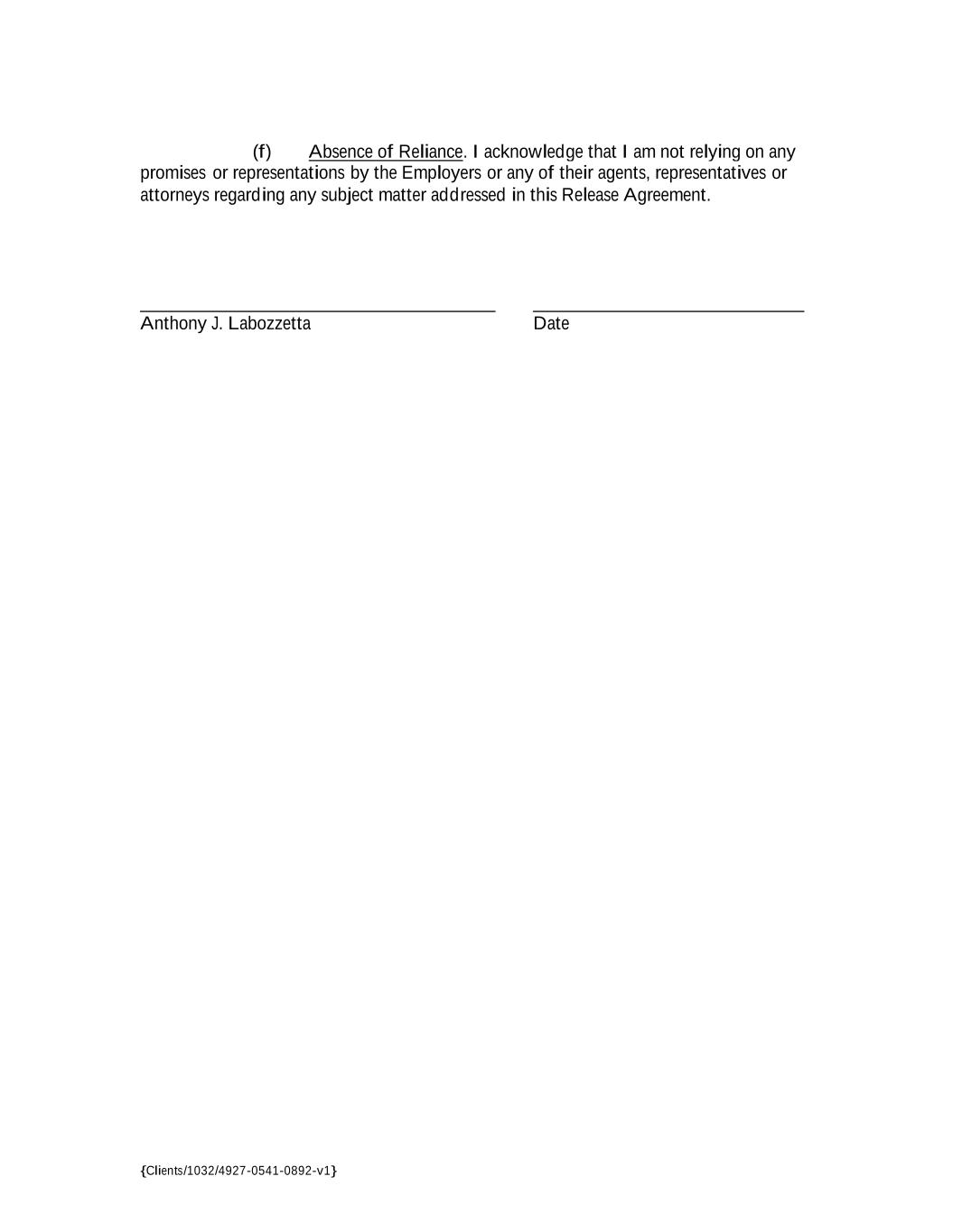 {Clients/1032/4927-0541-0892-v1} (f) Absence of Reliance. I acknowledge that I am not relying on any promises or representations by the Employers or any of their agents, representatives or attorneys regarding any subject matter addressed in this Release Agreement. ______________________________________ _____________________________ Anthony J. Labozzetta Date