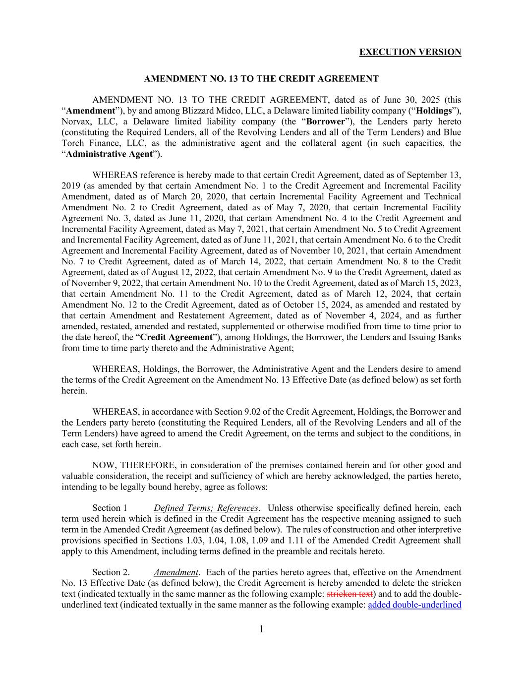 EXECUTION VERSION 1 AMENDMENT NO. 13 TO THE CREDIT AGREEMENT AMENDMENT NO. 13 TO THE CREDIT AGREEMENT, dated as of June 30, 2025 (this “Amendment”), by and among Blizzard Midco, LLC, a Delaware limited liability company (“Holdings”), Norvax, LLC, a Delaware limited liability company (the “Borrower”), the Lenders party hereto (constituting the Required Lenders, all of the Revolving Lenders and all of the Term Lenders) and Blue Torch Finance, LLC, as the administrative agent and the collateral agent (in such capacities, the “Administrative Agent”). WHEREAS reference is hereby made to that certain Credit Agreement, dated as of September 13, 2019 (as amended by that certain Amendment No. 1 to the Credit Agreement and Incremental Facility Amendment, dated as of March 20, 2020, that certain Incremental Facility Agreement and Technical Amendment No. 2 to Credit Agreement, dated as of May 7, 2020, that certain Incremental Facility Agreement No. 3, dated as June 11, 2020, that certain Amendment No. 4 to the Credit Agreement and Incremental Facility Agreement, dated as May 7, 2021, that certain Amendment No. 5 to Credit Agreement and Incremental Facility Agreement, dated as of June 11, 2021, that certain Amendment No. 6 to the Credit Agreement and Incremental Facility Agreement, dated as of November 10, 2021, that certain Amendment No. 7 to Credit Agreement, dated as of March 14, 2022, that certain Amendment No. 8 to the Credit Agreement, dated as of August 12, 2022, that certain Amendment No. 9 to the Credit Agreement, dated as of November 9, 2022, that certain Amendment No. 10 to the Credit Agreement, dated as of March 15, 2023, that certain Amendment No. 11 to the Credit Agreement, dated as of March 12, 2024, that certain Amendment No. 12 to the Credit Agreement, dated as of October 15, 2024, as amended and restated by that certain Amendment and Restatement Agreement, dated as of November 4, 2024, and as further amended, restated, amended and restated, supplemented or otherwise modified from time to time prior to the date hereof, the “Credit Agreement”), among Holdings, the Borrower, the Lenders and Issuing Banks from time to time party thereto and the Administrative Agent; WHEREAS, Holdings, the Borrower, the Administrative Agent and the Lenders desire to amend the terms of the Credit Agreement on the Amendment No. 13 Effective Date (as defined below) as set forth herein. WHEREAS, in accordance with Section 9.02 of the Credit Agreement, Holdings, the Borrower and the Lenders party hereto (constituting the Required Lenders, all of the Revolving Lenders and all of the Term Lenders) have agreed to amend the Credit Agreement, on the terms and subject to the conditions, in each case, set forth herein. NOW, THEREFORE, in consideration of the premises contained herein and for other good and valuable consideration, the receipt and sufficiency of which are hereby acknowledged, the parties hereto, intending to be legally bound hereby, agree as follows: Section 1 Defined Terms; References. Unless otherwise specifically defined herein, each term used herein which is defined in the Credit Agreement has the respective meaning assigned to such term in the Amended Credit Agreement (as defined below). The rules of construction and other interpretive provisions specified in Sections 1.03, 1.04, 1.08, 1.09 and 1.11 of the Amended Credit Agreement shall apply to this Amendment, including terms defined in the preamble and recitals hereto. Section 2. Amendment. Each of the parties hereto agrees that, effective on the Amendment No. 13 Effective Date (as defined below), the Credit Agreement is hereby amended to delete the stricken text (indicated textually in the same manner as the following example: stricken text) and to add the double- underlined text (indicated textually in the same manner as the following example: added double-underlined