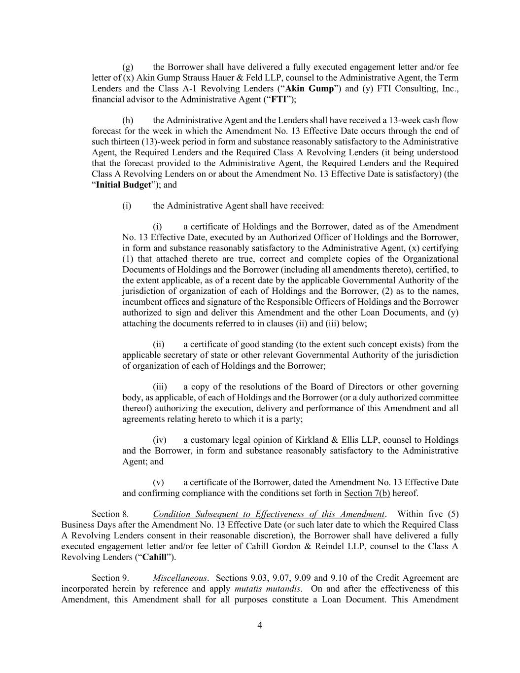 4 (g) the Borrower shall have delivered a fully executed engagement letter and/or fee letter of (x) Akin Gump Strauss Hauer & Feld LLP, counsel to the Administrative Agent, the Term Lenders and the Class A-1 Revolving Lenders (“Akin Gump”) and (y) FTI Consulting, Inc., financial advisor to the Administrative Agent (“FTI”); (h) the Administrative Agent and the Lenders shall have received a 13-week cash flow forecast for the week in which the Amendment No. 13 Effective Date occurs through the end of such thirteen (13)-week period in form and substance reasonably satisfactory to the Administrative Agent, the Required Lenders and the Required Class A Revolving Lenders (it being understood that the forecast provided to the Administrative Agent, the Required Lenders and the Required Class A Revolving Lenders on or about the Amendment No. 13 Effective Date is satisfactory) (the “Initial Budget”); and (i) the Administrative Agent shall have received: (i) a certificate of Holdings and the Borrower, dated as of the Amendment No. 13 Effective Date, executed by an Authorized Officer of Holdings and the Borrower, in form and substance reasonably satisfactory to the Administrative Agent, (x) certifying (1) that attached thereto are true, correct and complete copies of the Organizational Documents of Holdings and the Borrower (including all amendments thereto), certified, to the extent applicable, as of a recent date by the applicable Governmental Authority of the jurisdiction of organization of each of Holdings and the Borrower, (2) as to the names, incumbent offices and signature of the Responsible Officers of Holdings and the Borrower authorized to sign and deliver this Amendment and the other Loan Documents, and (y) attaching the documents referred to in clauses (ii) and (iii) below; (ii) a certificate of good standing (to the extent such concept exists) from the applicable secretary of state or other relevant Governmental Authority of the jurisdiction of organization of each of Holdings and the Borrower; (iii) a copy of the resolutions of the Board of Directors or other governing body, as applicable, of each of Holdings and the Borrower (or a duly authorized committee thereof) authorizing the execution, delivery and performance of this Amendment and all agreements relating hereto to which it is a party; (iv) a customary legal opinion of Kirkland & Ellis LLP, counsel to Holdings and the Borrower, in form and substance reasonably satisfactory to the Administrative Agent; and (v) a certificate of the Borrower, dated the Amendment No. 13 Effective Date and confirming compliance with the conditions set forth in Section 7(b) hereof. Section 8. Condition Subsequent to Effectiveness of this Amendment. Within five (5) Business Days after the Amendment No. 13 Effective Date (or such later date to which the Required Class A Revolving Lenders consent in their reasonable discretion), the Borrower shall have delivered a fully executed engagement letter and/or fee letter of Cahill Gordon & Reindel LLP, counsel to the Class A Revolving Lenders (“Cahill”). Section 9. Miscellaneous. Sections 9.03, 9.07, 9.09 and 9.10 of the Credit Agreement are incorporated herein by reference and apply mutatis mutandis. On and after the effectiveness of this Amendment, this Amendment shall for all purposes constitute a Loan Document. This Amendment