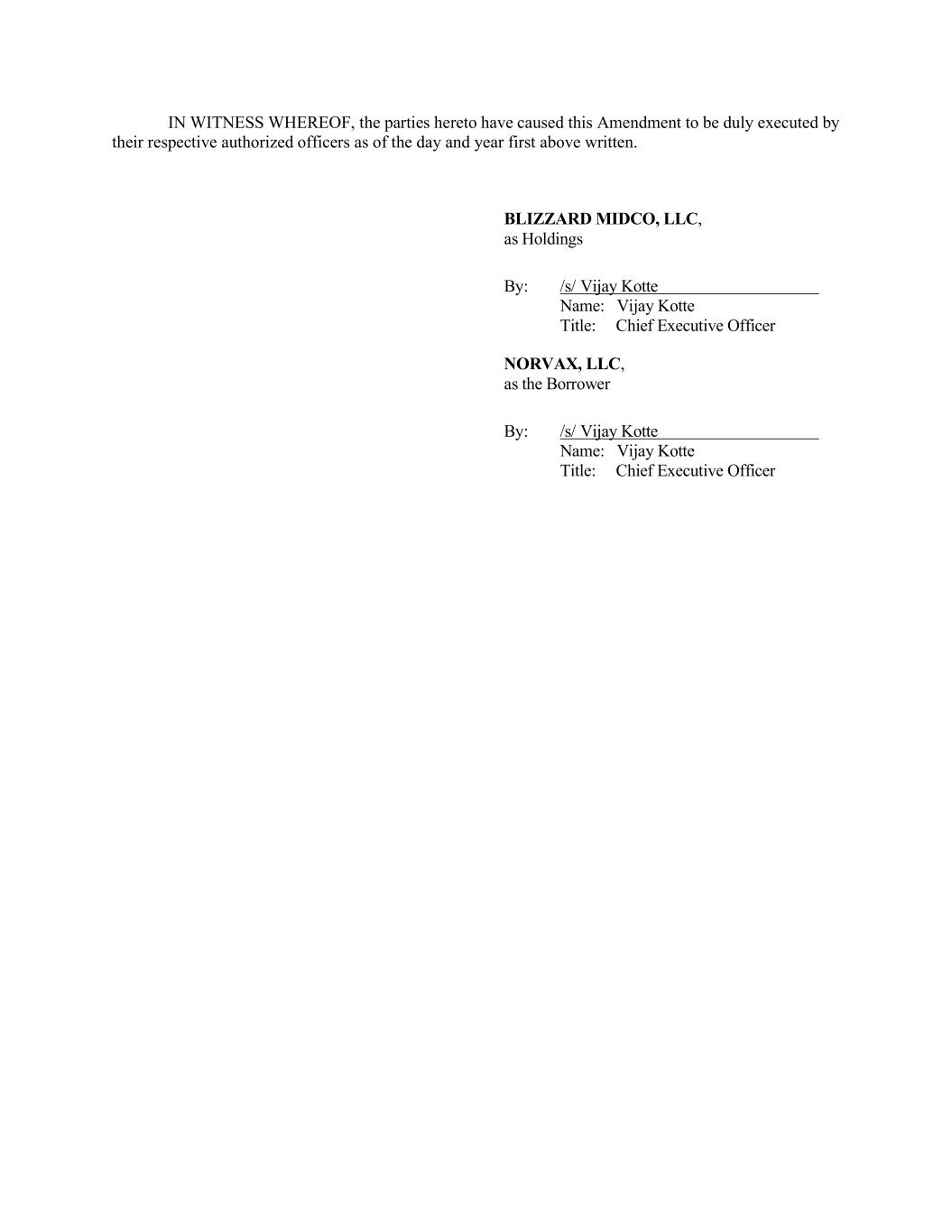 IN WITNESS WHEREOF, the parties hereto have caused this Amendment to be duly executed by their respective authorized officers as of the day and year first above written. BLIZZARD MIDCO, LLC, as Holdings By: /s/ Vijay Kotte Name: Vijay Kotte Title: Chief Executive Officer NORVAX, LLC, as the Borrower By: /s/ Vijay Kotte Name: Vijay Kotte Title: Chief Executive Officer