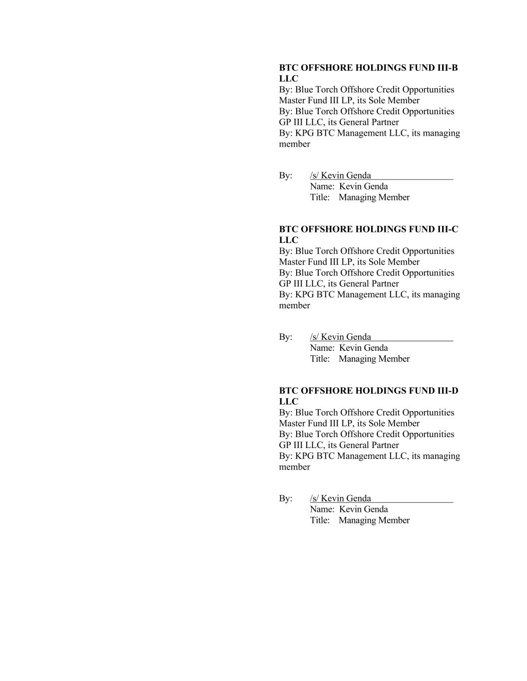 BTC OFFSHORE HOLDINGS FUND III-B LLC By: Blue Torch Offshore Credit Opportunities Master Fund III LP, its Sole Member By: Blue Torch Offshore Credit Opportunities GP III LLC, its General Partner By: KPG BTC Management LLC, its managing member By: /s/ Kevin Genda Name: Kevin Genda Title: Managing Member BTC OFFSHORE HOLDINGS FUND III-C LLC By: Blue Torch Offshore Credit Opportunities Master Fund III LP, its Sole Member By: Blue Torch Offshore Credit Opportunities GP III LLC, its General Partner By: KPG BTC Management LLC, its managing member By: /s/ Kevin Genda Name: Kevin Genda Title: Managing Member BTC OFFSHORE HOLDINGS FUND III-D LLC By: Blue Torch Offshore Credit Opportunities Master Fund III LP, its Sole Member By: Blue Torch Offshore Credit Opportunities GP III LLC, its General Partner By: KPG BTC Management LLC, its managing member By: /s/ Kevin Genda Name: Kevin Genda Title: Managing Member
