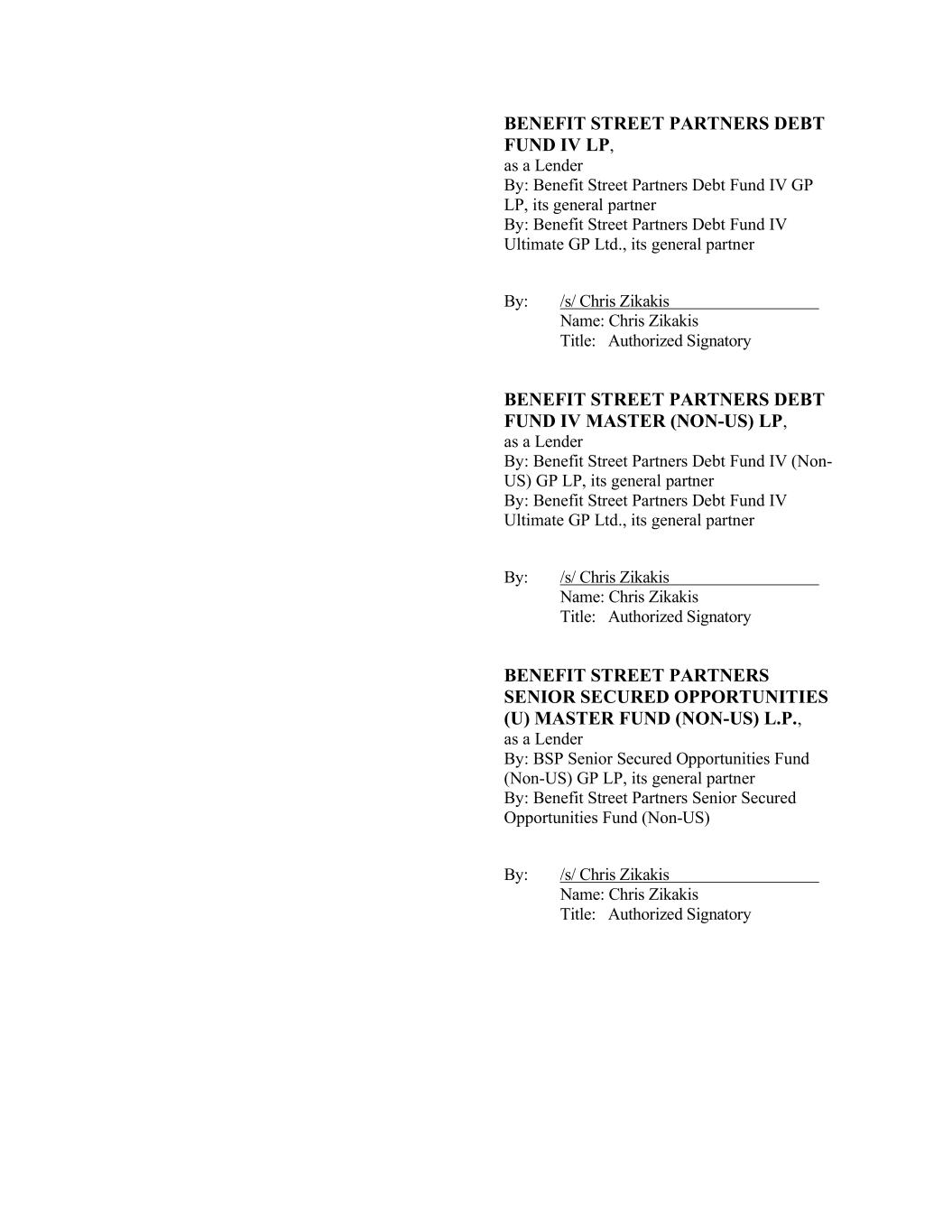 BENEFIT STREET PARTNERS DEBT FUND IV LP, as a Lender By: Benefit Street Partners Debt Fund IV GP LP, its general partner By: Benefit Street Partners Debt Fund IV Ultimate GP Ltd., its general partner By: /s/ Chris Zikakis Name: Chris Zikakis Title: Authorized Signatory BENEFIT STREET PARTNERS DEBT FUND IV MASTER (NON-US) LP, as a Lender By: Benefit Street Partners Debt Fund IV (Non- US) GP LP, its general partner By: Benefit Street Partners Debt Fund IV Ultimate GP Ltd., its general partner By: /s/ Chris Zikakis Name: Chris Zikakis Title: Authorized Signatory BENEFIT STREET PARTNERS SENIOR SECURED OPPORTUNITIES (U) MASTER FUND (NON-US) L.P., as a Lender By: BSP Senior Secured Opportunities Fund (Non-US) GP LP, its general partner By: Benefit Street Partners Senior Secured Opportunities Fund (Non-US) By: /s/ Chris Zikakis Name: Chris Zikakis Title: Authorized Signatory