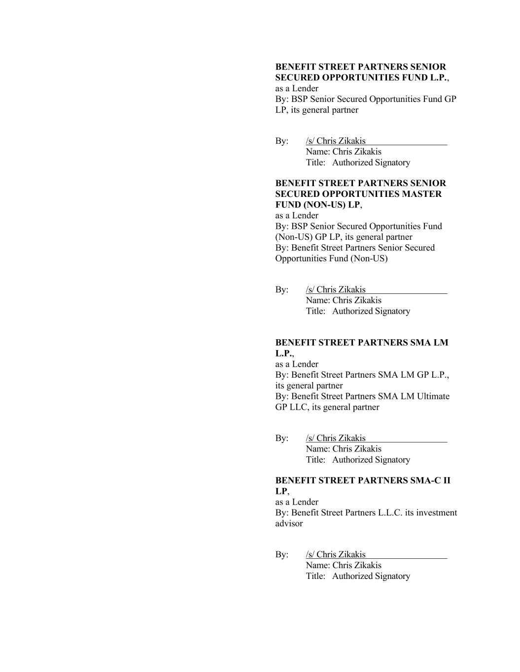 BENEFIT STREET PARTNERS SENIOR SECURED OPPORTUNITIES FUND L.P., as a Lender By: BSP Senior Secured Opportunities Fund GP LP, its general partner By: /s/ Chris Zikakis Name: Chris Zikakis Title: Authorized Signatory BENEFIT STREET PARTNERS SENIOR SECURED OPPORTUNITIES MASTER FUND (NON-US) LP, as a Lender By: BSP Senior Secured Opportunities Fund (Non-US) GP LP, its general partner By: Benefit Street Partners Senior Secured Opportunities Fund (Non-US) By: /s/ Chris Zikakis Name: Chris Zikakis Title: Authorized Signatory BENEFIT STREET PARTNERS SMA LM L.P., as a Lender By: Benefit Street Partners SMA LM GP L.P., its general partner By: Benefit Street Partners SMA LM Ultimate GP LLC, its general partner By: /s/ Chris Zikakis Name: Chris Zikakis Title: Authorized Signatory BENEFIT STREET PARTNERS SMA-C II LP, as a Lender By: Benefit Street Partners L.L.C. its investment advisor By: /s/ Chris Zikakis Name: Chris Zikakis Title: Authorized Signatory