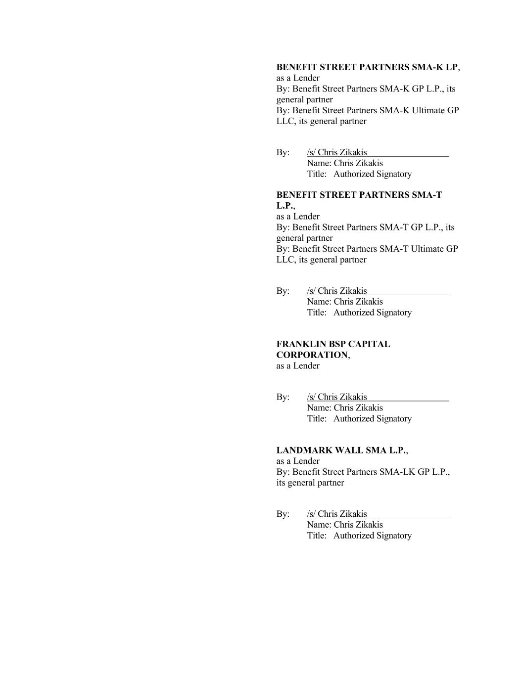 BENEFIT STREET PARTNERS SMA-K LP, as a Lender By: Benefit Street Partners SMA-K GP L.P., its general partner By: Benefit Street Partners SMA-K Ultimate GP LLC, its general partner By: /s/ Chris Zikakis Name: Chris Zikakis Title: Authorized Signatory BENEFIT STREET PARTNERS SMA-T L.P., as a Lender By: Benefit Street Partners SMA-T GP L.P., its general partner By: Benefit Street Partners SMA-T Ultimate GP LLC, its general partner By: /s/ Chris Zikakis Name: Chris Zikakis Title: Authorized Signatory FRANKLIN BSP CAPITAL CORPORATION, as a Lender By: /s/ Chris Zikakis Name: Chris Zikakis Title: Authorized Signatory LANDMARK WALL SMA L.P., as a Lender By: Benefit Street Partners SMA-LK GP L.P., its general partner By: /s/ Chris Zikakis Name: Chris Zikakis Title: Authorized Signatory