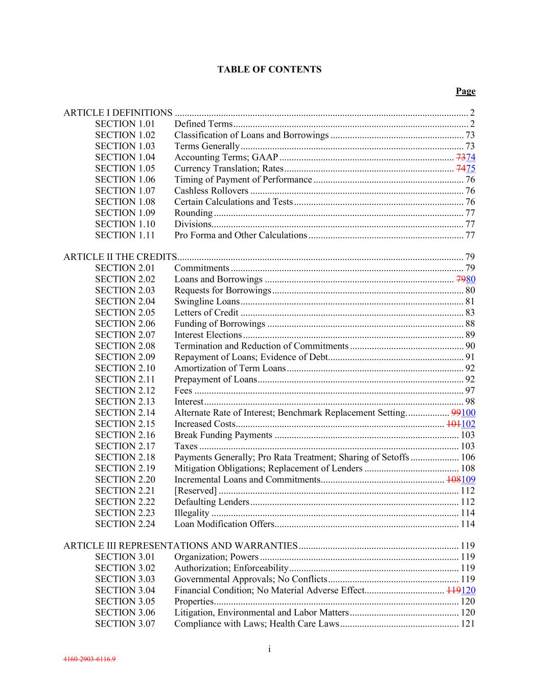 i 4160-2903-6116.9 TABLE OF CONTENTS Page ARTICLE I DEFINITIONS ......................................................................................................................... 2 SECTION 1.01 Defined Terms ................................................................................................. 2 SECTION 1.02 Classification of Loans and Borrowings ....................................................... 73 SECTION 1.03 Terms Generally ............................................................................................ 73 SECTION 1.04 Accounting Terms; GAAP ........................................................................ 7374 SECTION 1.05 Currency Translation; Rates ...................................................................... 7475 SECTION 1.06 Timing of Payment of Performance .............................................................. 76 SECTION 1.07 Cashless Rollovers ........................................................................................ 76 SECTION 1.08 Certain Calculations and Tests ...................................................................... 76 SECTION 1.09 Rounding ....................................................................................................... 77 SECTION 1.10 Divisions........................................................................................................ 77 SECTION 1.11 Pro Forma and Other Calculations ................................................................ 77 ARTICLE II THE CREDITS ...................................................................................................................... 79 SECTION 2.01 Commitments ................................................................................................ 79 SECTION 2.02 Loans and Borrowings .............................................................................. 7980 SECTION 2.03 Requests for Borrowings ............................................................................... 80 SECTION 2.04 Swingline Loans ............................................................................................ 81 SECTION 2.05 Letters of Credit ............................................................................................ 83 SECTION 2.06 Funding of Borrowings ................................................................................. 88 SECTION 2.07 Interest Elections ........................................................................................... 89 SECTION 2.08 Termination and Reduction of Commitments ............................................... 90 SECTION 2.09 Repayment of Loans; Evidence of Debt ........................................................ 91 SECTION 2.10 Amortization of Term Loans ......................................................................... 92 SECTION 2.11 Prepayment of Loans ..................................................................................... 92 SECTION 2.12 Fees ............................................................................................................... 97 SECTION 2.13 Interest ........................................................................................................... 98 SECTION 2.14 Alternate Rate of Interest; Benchmark Replacement Setting. ................. 99100 SECTION 2.15 Increased Costs ...................................................................................... 101102 SECTION 2.16 Break Funding Payments ............................................................................ 103 SECTION 2.17 Taxes ........................................................................................................... 103 SECTION 2.18 Payments Generally; Pro Rata Treatment; Sharing of Setoffs .................... 106 SECTION 2.19 Mitigation Obligations; Replacement of Lenders ....................................... 108 SECTION 2.20 Incremental Loans and Commitments ................................................... 108109 SECTION 2.21 [Reserved] ................................................................................................... 112 SECTION 2.22 Defaulting Lenders ...................................................................................... 112 SECTION 2.23 Illegality ...................................................................................................... 114 SECTION 2.24 Loan Modification Offers ............................................................................ 114 ARTICLE III REPRESENTATIONS AND WARRANTIES .................................................................. 119 SECTION 3.01 Organization; Powers .................................................................................. 119 SECTION 3.02 Authorization; Enforceability ...................................................................... 119 SECTION 3.03 Governmental Approvals; No Conflicts ...................................................... 119 SECTION 3.04 Financial Condition; No Material Adverse Effect................................. 119120 SECTION 3.05 Properties ..................................................................................................... 120 SECTION 3.06 Litigation, Environmental and Labor Matters ............................................. 120 SECTION 3.07 Compliance with Laws; Health Care Laws ................................................. 121
