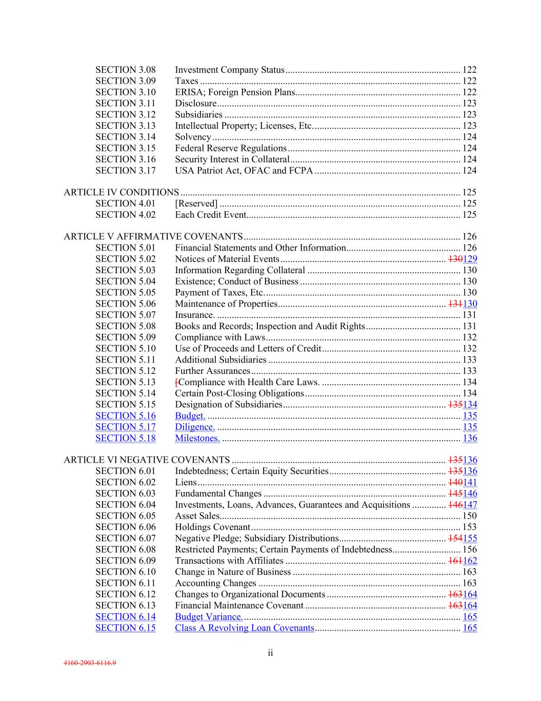 ii 4160-2903-6116.9 SECTION 3.08 Investment Company Status ........................................................................ 122 SECTION 3.09 Taxes ........................................................................................................... 122 SECTION 3.10 ERISA; Foreign Pension Plans.................................................................... 122 SECTION 3.11 Disclosure .................................................................................................... 123 SECTION 3.12 Subsidiaries ................................................................................................. 123 SECTION 3.13 Intellectual Property; Licenses, Etc. ............................................................ 123 SECTION 3.14 Solvency ...................................................................................................... 124 SECTION 3.15 Federal Reserve Regulations ....................................................................... 124 SECTION 3.16 Security Interest in Collateral ...................................................................... 124 SECTION 3.17 USA Patriot Act, OFAC and FCPA ............................................................ 124 ARTICLE IV CONDITIONS ................................................................................................................... 125 SECTION 4.01 [Reserved] ................................................................................................... 125 SECTION 4.02 Each Credit Event ........................................................................................ 125 ARTICLE V AFFIRMATIVE COVENANTS ......................................................................................... 126 SECTION 5.01 Financial Statements and Other Information ............................................... 126 SECTION 5.02 Notices of Material Events .................................................................... 130129 SECTION 5.03 Information Regarding Collateral ............................................................... 130 SECTION 5.04 Existence; Conduct of Business .................................................................. 130 SECTION 5.05 Payment of Taxes, Etc. ................................................................................ 130 SECTION 5.06 Maintenance of Properties ..................................................................... 131130 SECTION 5.07 Insurance. .................................................................................................... 131 SECTION 5.08 Books and Records; Inspection and Audit Rights ....................................... 131 SECTION 5.09 Compliance with Laws ................................................................................ 132 SECTION 5.10 Use of Proceeds and Letters of Credit ......................................................... 132 SECTION 5.11 Additional Subsidiaries ............................................................................... 133 SECTION 5.12 Further Assurances ...................................................................................... 133 SECTION 5.13 [Compliance with Health Care Laws. ......................................................... 134 SECTION 5.14 Certain Post-Closing Obligations ................................................................ 134 SECTION 5.15 Designation of Subsidiaries ................................................................... 135134 SECTION 5.16 Budget. ........................................................................................................ 135 SECTION 5.17 Diligence. .................................................................................................... 135 SECTION 5.18 Milestones. .................................................................................................. 136 ARTICLE VI NEGATIVE COVENANTS ........................................................................................ 135136 SECTION 6.01 Indebtedness; Certain Equity Securities ................................................ 135136 SECTION 6.02 Liens ...................................................................................................... 140141 SECTION 6.03 Fundamental Changes ........................................................................... 145146 SECTION 6.04 Investments, Loans, Advances, Guarantees and Acquisitions .............. 146147 SECTION 6.05 Asset Sales................................................................................................... 150 SECTION 6.06 Holdings Covenant ...................................................................................... 153 SECTION 6.07 Negative Pledge; Subsidiary Distributions ............................................ 154155 SECTION 6.08 Restricted Payments; Certain Payments of Indebtedness ............................ 156 SECTION 6.09 Transactions with Affiliates .................................................................. 161162 SECTION 6.10 Change in Nature of Business ..................................................................... 163 SECTION 6.11 Accounting Changes ................................................................................... 163 SECTION 6.12 Changes to Organizational Documents ................................................. 163164 SECTION 6.13 Financial Maintenance Covenant .......................................................... 163164 SECTION 6.14 Budget Variance. ......................................................................................... 165 SECTION 6.15 Class A Revolving Loan Covenants ............................................................ 165