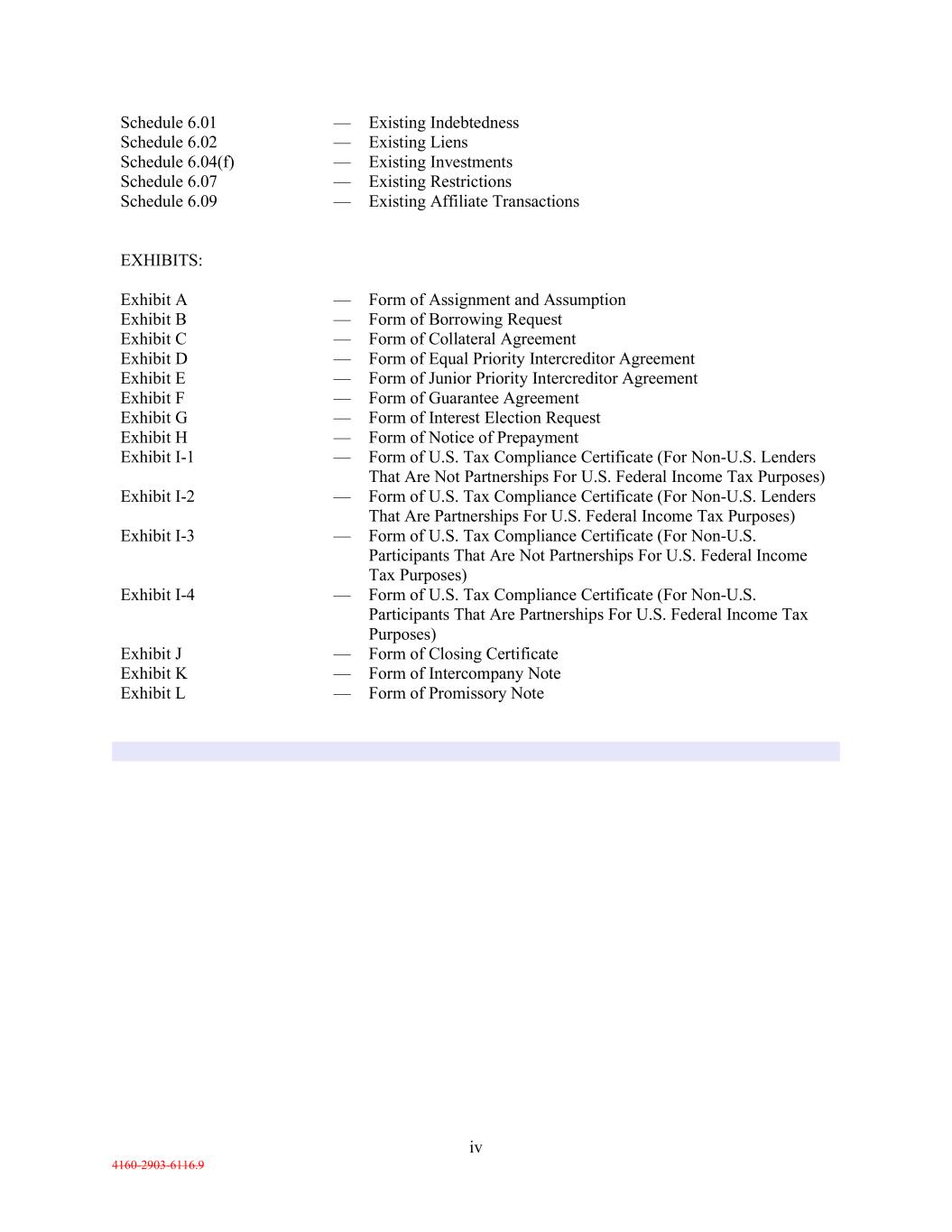 iv 4160-2903-6116.9 Schedule 6.01 — Existing Indebtedness Schedule 6.02 — Existing Liens Schedule 6.04(f) — Existing Investments Schedule 6.07 — Existing Restrictions Schedule 6.09 — Existing Affiliate Transactions EXHIBITS: Exhibit A — Form of Assignment and Assumption Exhibit B — Form of Borrowing Request Exhibit C — Form of Collateral Agreement Exhibit D — Form of Equal Priority Intercreditor Agreement Exhibit E — Form of Junior Priority Intercreditor Agreement Exhibit F — Form of Guarantee Agreement Exhibit G — Form of Interest Election Request Exhibit H — Form of Notice of Prepayment Exhibit I-1 — Form of U.S. Tax Compliance Certificate (For Non-U.S. Lenders That Are Not Partnerships For U.S. Federal Income Tax Purposes) Exhibit I-2 — Form of U.S. Tax Compliance Certificate (For Non-U.S. Lenders That Are Partnerships For U.S. Federal Income Tax Purposes) Exhibit I-3 — Form of U.S. Tax Compliance Certificate (For Non-U.S. Participants That Are Not Partnerships For U.S. Federal Income Tax Purposes) Exhibit I-4 — Form of U.S. Tax Compliance Certificate (For Non-U.S. Participants That Are Partnerships For U.S. Federal Income Tax Purposes) Exhibit J — Form of Closing Certificate Exhibit K — Form of Intercompany Note Exhibit L — Form of Promissory Note