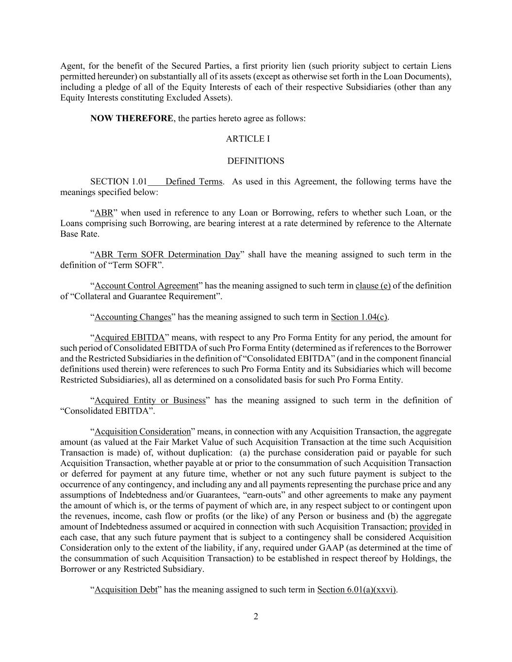 2 Agent, for the benefit of the Secured Parties, a first priority lien (such priority subject to certain Liens permitted hereunder) on substantially all of its assets (except as otherwise set forth in the Loan Documents), including a pledge of all of the Equity Interests of each of their respective Subsidiaries (other than any Equity Interests constituting Excluded Assets). NOW THEREFORE, the parties hereto agree as follows: ARTICLE I DEFINITIONS SECTION 1.01 Defined Terms. As used in this Agreement, the following terms have the meanings specified below: “ABR” when used in reference to any Loan or Borrowing, refers to whether such Loan, or the Loans comprising such Borrowing, are bearing interest at a rate determined by reference to the Alternate Base Rate. “ABR Term SOFR Determination Day” shall have the meaning assigned to such term in the definition of “Term SOFR”. “Account Control Agreement” has the meaning assigned to such term in clause (e) of the definition of “Collateral and Guarantee Requirement”. “Accounting Changes” has the meaning assigned to such term in Section 1.04(c). “Acquired EBITDA” means, with respect to any Pro Forma Entity for any period, the amount for such period of Consolidated EBITDA of such Pro Forma Entity (determined as if references to the Borrower and the Restricted Subsidiaries in the definition of “Consolidated EBITDA” (and in the component financial definitions used therein) were references to such Pro Forma Entity and its Subsidiaries which will become Restricted Subsidiaries), all as determined on a consolidated basis for such Pro Forma Entity. “Acquired Entity or Business” has the meaning assigned to such term in the definition of “Consolidated EBITDA”. “Acquisition Consideration” means, in connection with any Acquisition Transaction, the aggregate amount (as valued at the Fair Market Value of such Acquisition Transaction at the time such Acquisition Transaction is made) of, without duplication: (a) the purchase consideration paid or payable for such Acquisition Transaction, whether payable at or prior to the consummation of such Acquisition Transaction or deferred for payment at any future time, whether or not any such future payment is subject to the occurrence of any contingency, and including any and all payments representing the purchase price and any assumptions of Indebtedness and/or Guarantees, “earn-outs” and other agreements to make any payment the amount of which is, or the terms of payment of which are, in any respect subject to or contingent upon the revenues, income, cash flow or profits (or the like) of any Person or business and (b) the aggregate amount of Indebtedness assumed or acquired in connection with such Acquisition Transaction; provided in each case, that any such future payment that is subject to a contingency shall be considered Acquisition Consideration only to the extent of the liability, if any, required under GAAP (as determined at the time of the consummation of such Acquisition Transaction) to be established in respect thereof by Holdings, the Borrower or any Restricted Subsidiary. “Acquisition Debt” has the meaning assigned to such term in Section 6.01(a)(xxvi).