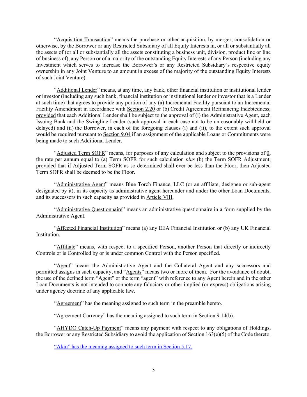 3 “Acquisition Transaction” means the purchase or other acquisition, by merger, consolidation or otherwise, by the Borrower or any Restricted Subsidiary of all Equity Interests in, or all or substantially all the assets of (or all or substantially all the assets constituting a business unit, division, product line or line of business of), any Person or of a majority of the outstanding Equity Interests of any Person (including any Investment which serves to increase the Borrower’s or any Restricted Subsidiary’s respective equity ownership in any Joint Venture to an amount in excess of the majority of the outstanding Equity Interests of such Joint Venture). “Additional Lender” means, at any time, any bank, other financial institution or institutional lender or investor (including any such bank, financial institution or institutional lender or investor that is a Lender at such time) that agrees to provide any portion of any (a) Incremental Facility pursuant to an Incremental Facility Amendment in accordance with Section 2.20 or (b) Credit Agreement Refinancing Indebtedness; provided that each Additional Lender shall be subject to the approval of (i) the Administrative Agent, each Issuing Bank and the Swingline Lender (such approval in each case not to be unreasonably withheld or delayed) and (ii) the Borrower, in each of the foregoing clauses (i) and (ii), to the extent such approval would be required pursuant to Section 9.04 if an assignment of the applicable Loans or Commitments were being made to such Additional Lender. “Adjusted Term SOFR” means, for purposes of any calculation and subject to the provisions of 0, the rate per annum equal to (a) Term SOFR for such calculation plus (b) the Term SOFR Adjustment; provided that if Adjusted Term SOFR as so determined shall ever be less than the Floor, then Adjusted Term SOFR shall be deemed to be the Floor. “Administrative Agent” means Blue Torch Finance, LLC (or an affiliate, designee or sub-agent designated by it), in its capacity as administrative agent hereunder and under the other Loan Documents, and its successors in such capacity as provided in Article VIII. “Administrative Questionnaire” means an administrative questionnaire in a form supplied by the Administrative Agent. “Affected Financial Institution” means (a) any EEA Financial Institution or (b) any UK Financial Institution. “Affiliate” means, with respect to a specified Person, another Person that directly or indirectly Controls or is Controlled by or is under common Control with the Person specified. “Agent” means the Administrative Agent and the Collateral Agent and any successors and permitted assigns in such capacity, and “Agents” means two or more of them. For the avoidance of doubt, the use of the defined term “Agent” or the term “agent” with reference to any Agent herein and in the other Loan Documents is not intended to connote any fiduciary or other implied (or express) obligations arising under agency doctrine of any applicable law. “Agreement” has the meaning assigned to such term in the preamble hereto. “Agreement Currency” has the meaning assigned to such term in Section 9.14(b). “AHYDO Catch-Up Payment” means any payment with respect to any obligations of Holdings, the Borrower or any Restricted Subsidiary to avoid the application of Section 163(e)(5) of the Code thereto. “Akin” has the meaning assigned to such term in Section 5.17.
