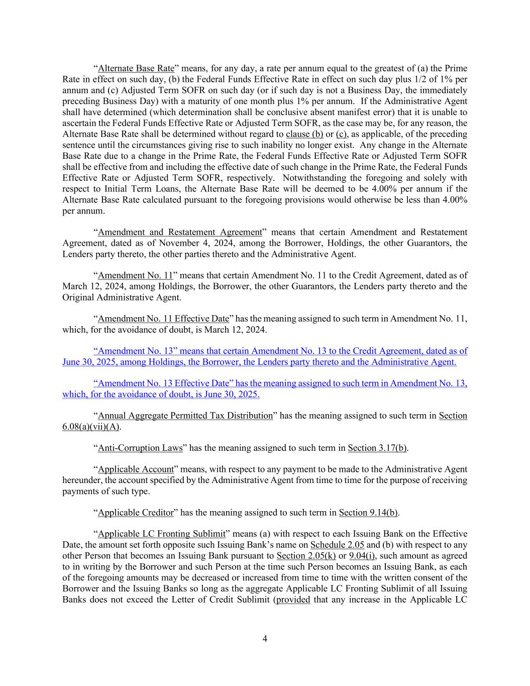 4 “Alternate Base Rate” means, for any day, a rate per annum equal to the greatest of (a) the Prime Rate in effect on such day, (b) the Federal Funds Effective Rate in effect on such day plus 1/2 of 1% per annum and (c) Adjusted Term SOFR on such day (or if such day is not a Business Day, the immediately preceding Business Day) with a maturity of one month plus 1% per annum. If the Administrative Agent shall have determined (which determination shall be conclusive absent manifest error) that it is unable to ascertain the Federal Funds Effective Rate or Adjusted Term SOFR, as the case may be, for any reason, the Alternate Base Rate shall be determined without regard to clause (b) or (c), as applicable, of the preceding sentence until the circumstances giving rise to such inability no longer exist. Any change in the Alternate Base Rate due to a change in the Prime Rate, the Federal Funds Effective Rate or Adjusted Term SOFR shall be effective from and including the effective date of such change in the Prime Rate, the Federal Funds Effective Rate or Adjusted Term SOFR, respectively. Notwithstanding the foregoing and solely with respect to Initial Term Loans, the Alternate Base Rate will be deemed to be 4.00% per annum if the Alternate Base Rate calculated pursuant to the foregoing provisions would otherwise be less than 4.00% per annum. “Amendment and Restatement Agreement” means that certain Amendment and Restatement Agreement, dated as of November 4, 2024, among the Borrower, Holdings, the other Guarantors, the Lenders party thereto, the other parties thereto and the Administrative Agent. “Amendment No. 11” means that certain Amendment No. 11 to the Credit Agreement, dated as of March 12, 2024, among Holdings, the Borrower, the other Guarantors, the Lenders party thereto and the Original Administrative Agent. “Amendment No. 11 Effective Date” has the meaning assigned to such term in Amendment No. 11, which, for the avoidance of doubt, is March 12, 2024. “Amendment No. 13” means that certain Amendment No. 13 to the Credit Agreement, dated as of June 30, 2025, among Holdings, the Borrower, the Lenders party thereto and the Administrative Agent. “Amendment No. 13 Effective Date” has the meaning assigned to such term in Amendment No. 13, which, for the avoidance of doubt, is June 30, 2025. “Annual Aggregate Permitted Tax Distribution” has the meaning assigned to such term in Section 6.08(a)(vii)(A). “Anti-Corruption Laws” has the meaning assigned to such term in Section 3.17(b). “Applicable Account” means, with respect to any payment to be made to the Administrative Agent hereunder, the account specified by the Administrative Agent from time to time for the purpose of receiving payments of such type. “Applicable Creditor” has the meaning assigned to such term in Section 9.14(b). “Applicable LC Fronting Sublimit” means (a) with respect to each Issuing Bank on the Effective Date, the amount set forth opposite such Issuing Bank’s name on Schedule 2.05 and (b) with respect to any other Person that becomes an Issuing Bank pursuant to Section 2.05(k) or 9.04(i), such amount as agreed to in writing by the Borrower and such Person at the time such Person becomes an Issuing Bank, as each of the foregoing amounts may be decreased or increased from time to time with the written consent of the Borrower and the Issuing Banks so long as the aggregate Applicable LC Fronting Sublimit of all Issuing Banks does not exceed the Letter of Credit Sublimit (provided that any increase in the Applicable LC