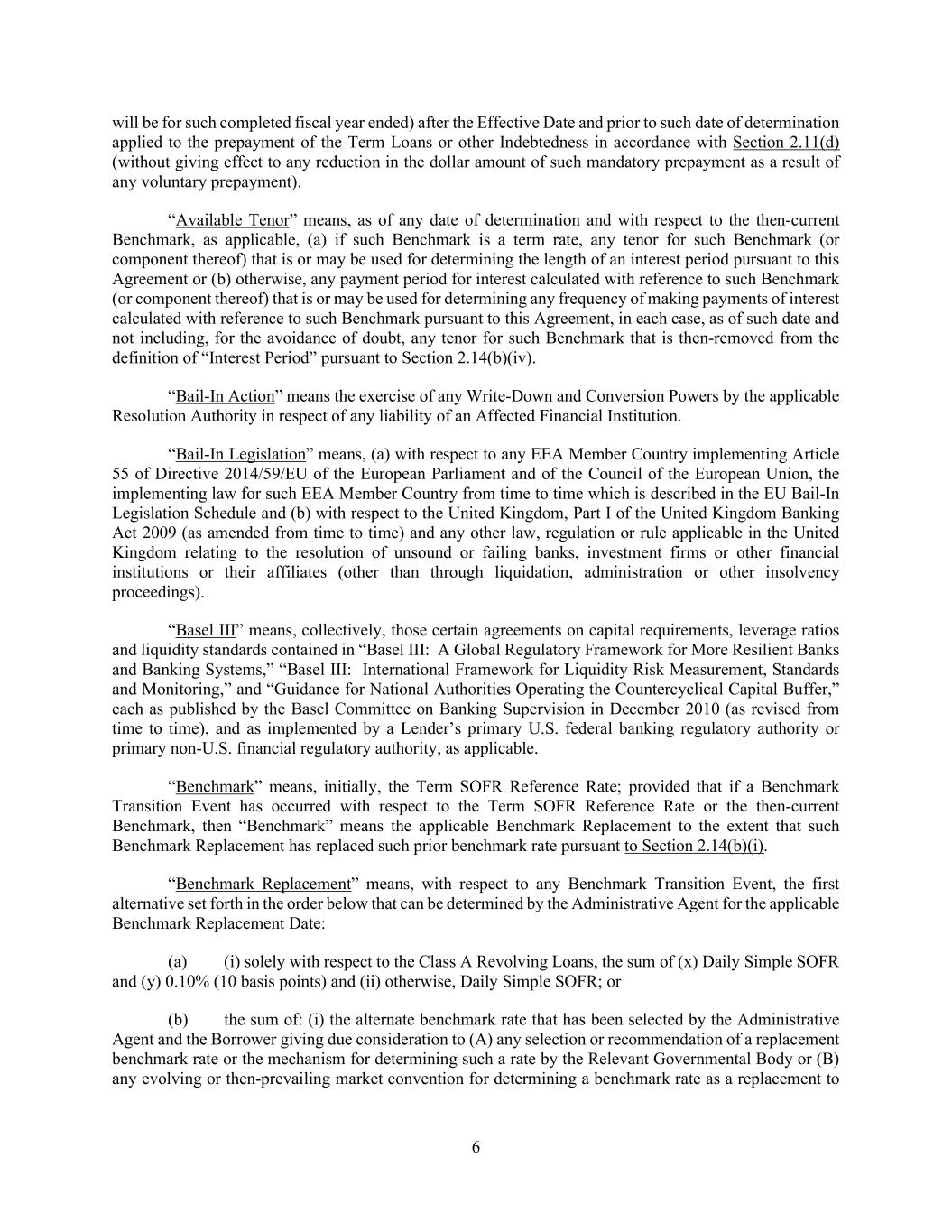 6 will be for such completed fiscal year ended) after the Effective Date and prior to such date of determination applied to the prepayment of the Term Loans or other Indebtedness in accordance with Section 2.11(d) (without giving effect to any reduction in the dollar amount of such mandatory prepayment as a result of any voluntary prepayment). “Available Tenor” means, as of any date of determination and with respect to the then-current Benchmark, as applicable, (a) if such Benchmark is a term rate, any tenor for such Benchmark (or component thereof) that is or may be used for determining the length of an interest period pursuant to this Agreement or (b) otherwise, any payment period for interest calculated with reference to such Benchmark (or component thereof) that is or may be used for determining any frequency of making payments of interest calculated with reference to such Benchmark pursuant to this Agreement, in each case, as of such date and not including, for the avoidance of doubt, any tenor for such Benchmark that is then-removed from the definition of “Interest Period” pursuant to Section 2.14(b)(iv). “Bail-In Action” means the exercise of any Write-Down and Conversion Powers by the applicable Resolution Authority in respect of any liability of an Affected Financial Institution. “Bail-In Legislation” means, (a) with respect to any EEA Member Country implementing Article 55 of Directive 2014/59/EU of the European Parliament and of the Council of the European Union, the implementing law for such EEA Member Country from time to time which is described in the EU Bail-In Legislation Schedule and (b) with respect to the United Kingdom, Part I of the United Kingdom Banking Act 2009 (as amended from time to time) and any other law, regulation or rule applicable in the United Kingdom relating to the resolution of unsound or failing banks, investment firms or other financial institutions or their affiliates (other than through liquidation, administration or other insolvency proceedings). “Basel III” means, collectively, those certain agreements on capital requirements, leverage ratios and liquidity standards contained in “Basel III: A Global Regulatory Framework for More Resilient Banks and Banking Systems,” “Basel III: International Framework for Liquidity Risk Measurement, Standards and Monitoring,” and “Guidance for National Authorities Operating the Countercyclical Capital Buffer,” each as published by the Basel Committee on Banking Supervision in December 2010 (as revised from time to time), and as implemented by a Lender’s primary U.S. federal banking regulatory authority or primary non-U.S. financial regulatory authority, as applicable. “Benchmark” means, initially, the Term SOFR Reference Rate; provided that if a Benchmark Transition Event has occurred with respect to the Term SOFR Reference Rate or the then-current Benchmark, then “Benchmark” means the applicable Benchmark Replacement to the extent that such Benchmark Replacement has replaced such prior benchmark rate pursuant to Section 2.14(b)(i). “Benchmark Replacement” means, with respect to any Benchmark Transition Event, the first alternative set forth in the order below that can be determined by the Administrative Agent for the applicable Benchmark Replacement Date: (a) (i) solely with respect to the Class A Revolving Loans, the sum of (x) Daily Simple SOFR and (y) 0.10% (10 basis points) and (ii) otherwise, Daily Simple SOFR; or (b) the sum of: (i) the alternate benchmark rate that has been selected by the Administrative Agent and the Borrower giving due consideration to (A) any selection or recommendation of a replacement benchmark rate or the mechanism for determining such a rate by the Relevant Governmental Body or (B) any evolving or then-prevailing market convention for determining a benchmark rate as a replacement to