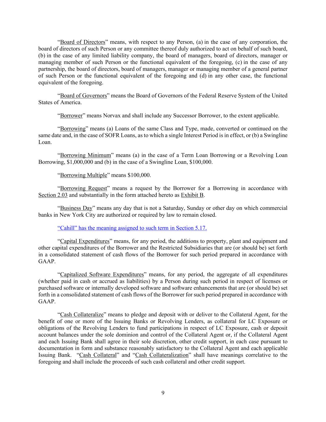 9 “Board of Directors” means, with respect to any Person, (a) in the case of any corporation, the board of directors of such Person or any committee thereof duly authorized to act on behalf of such board, (b) in the case of any limited liability company, the board of managers, board of directors, manager or managing member of such Person or the functional equivalent of the foregoing, (c) in the case of any partnership, the board of directors, board of managers, manager or managing member of a general partner of such Person or the functional equivalent of the foregoing and (d) in any other case, the functional equivalent of the foregoing. “Board of Governors” means the Board of Governors of the Federal Reserve System of the United States of America. “Borrower” means Norvax and shall include any Successor Borrower, to the extent applicable. “Borrowing” means (a) Loans of the same Class and Type, made, converted or continued on the same date and, in the case of SOFR Loans, as to which a single Interest Period is in effect, or (b) a Swingline Loan. “Borrowing Minimum” means (a) in the case of a Term Loan Borrowing or a Revolving Loan Borrowing, $1,000,000 and (b) in the case of a Swingline Loan, $100,000. “Borrowing Multiple” means $100,000. “Borrowing Request” means a request by the Borrower for a Borrowing in accordance with Section 2.03 and substantially in the form attached hereto as Exhibit B. “Business Day” means any day that is not a Saturday, Sunday or other day on which commercial banks in New York City are authorized or required by law to remain closed. “Cahill” has the meaning assigned to such term in Section 5.17. “Capital Expenditures” means, for any period, the additions to property, plant and equipment and other capital expenditures of the Borrower and the Restricted Subsidiaries that are (or should be) set forth in a consolidated statement of cash flows of the Borrower for such period prepared in accordance with GAAP. “Capitalized Software Expenditures” means, for any period, the aggregate of all expenditures (whether paid in cash or accrued as liabilities) by a Person during such period in respect of licenses or purchased software or internally developed software and software enhancements that are (or should be) set forth in a consolidated statement of cash flows of the Borrower for such period prepared in accordance with GAAP. “Cash Collateralize” means to pledge and deposit with or deliver to the Collateral Agent, for the benefit of one or more of the Issuing Banks or Revolving Lenders, as collateral for LC Exposure or obligations of the Revolving Lenders to fund participations in respect of LC Exposure, cash or deposit account balances under the sole dominion and control of the Collateral Agent or, if the Collateral Agent and each Issuing Bank shall agree in their sole discretion, other credit support, in each case pursuant to documentation in form and substance reasonably satisfactory to the Collateral Agent and each applicable Issuing Bank. “Cash Collateral” and “Cash Collateralization” shall have meanings correlative to the foregoing and shall include the proceeds of such cash collateral and other credit support.
