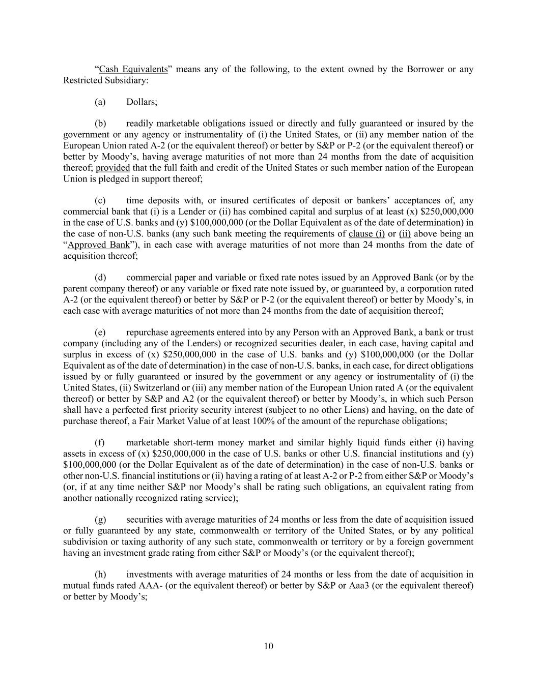 10 “Cash Equivalents” means any of the following, to the extent owned by the Borrower or any Restricted Subsidiary: (a) Dollars; (b) readily marketable obligations issued or directly and fully guaranteed or insured by the government or any agency or instrumentality of (i) the United States, or (ii) any member nation of the European Union rated A-2 (or the equivalent thereof) or better by S&P or P-2 (or the equivalent thereof) or better by Moody’s, having average maturities of not more than 24 months from the date of acquisition thereof; provided that the full faith and credit of the United States or such member nation of the European Union is pledged in support thereof; (c) time deposits with, or insured certificates of deposit or bankers’ acceptances of, any commercial bank that (i) is a Lender or (ii) has combined capital and surplus of at least (x) $250,000,000 in the case of U.S. banks and (y) $100,000,000 (or the Dollar Equivalent as of the date of determination) in the case of non-U.S. banks (any such bank meeting the requirements of clause (i) or (ii) above being an “Approved Bank”), in each case with average maturities of not more than 24 months from the date of acquisition thereof; (d) commercial paper and variable or fixed rate notes issued by an Approved Bank (or by the parent company thereof) or any variable or fixed rate note issued by, or guaranteed by, a corporation rated A-2 (or the equivalent thereof) or better by S&P or P-2 (or the equivalent thereof) or better by Moody’s, in each case with average maturities of not more than 24 months from the date of acquisition thereof; (e) repurchase agreements entered into by any Person with an Approved Bank, a bank or trust company (including any of the Lenders) or recognized securities dealer, in each case, having capital and surplus in excess of (x) $250,000,000 in the case of U.S. banks and (y) $100,000,000 (or the Dollar Equivalent as of the date of determination) in the case of non-U.S. banks, in each case, for direct obligations issued by or fully guaranteed or insured by the government or any agency or instrumentality of (i) the United States, (ii) Switzerland or (iii) any member nation of the European Union rated A (or the equivalent thereof) or better by S&P and A2 (or the equivalent thereof) or better by Moody’s, in which such Person shall have a perfected first priority security interest (subject to no other Liens) and having, on the date of purchase thereof, a Fair Market Value of at least 100% of the amount of the repurchase obligations; (f) marketable short-term money market and similar highly liquid funds either (i) having assets in excess of (x) $250,000,000 in the case of U.S. banks or other U.S. financial institutions and (y) $100,000,000 (or the Dollar Equivalent as of the date of determination) in the case of non-U.S. banks or other non-U.S. financial institutions or (ii) having a rating of at least A-2 or P-2 from either S&P or Moody’s (or, if at any time neither S&P nor Moody’s shall be rating such obligations, an equivalent rating from another nationally recognized rating service); (g) securities with average maturities of 24 months or less from the date of acquisition issued or fully guaranteed by any state, commonwealth or territory of the United States, or by any political subdivision or taxing authority of any such state, commonwealth or territory or by a foreign government having an investment grade rating from either S&P or Moody’s (or the equivalent thereof); (h) investments with average maturities of 24 months or less from the date of acquisition in mutual funds rated AAA- (or the equivalent thereof) or better by S&P or Aaa3 (or the equivalent thereof) or better by Moody’s;