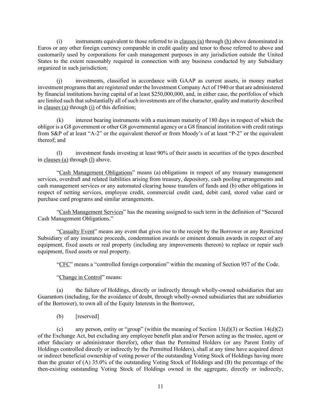 11 (i) instruments equivalent to those referred to in clauses (a) through (h) above denominated in Euros or any other foreign currency comparable in credit quality and tenor to those referred to above and customarily used by corporations for cash management purposes in any jurisdiction outside the United States to the extent reasonably required in connection with any business conducted by any Subsidiary organized in such jurisdiction; (j) investments, classified in accordance with GAAP as current assets, in money market investment programs that are registered under the Investment Company Act of 1940 or that are administered by financial institutions having capital of at least $250,000,000, and, in either case, the portfolios of which are limited such that substantially all of such investments are of the character, quality and maturity described in clauses (a) through (i) of this definition; (k) interest bearing instruments with a maximum maturity of 180 days in respect of which the obligor is a G8 government or other G8 governmental agency or a G8 financial institution with credit ratings from S&P of at least “A-2” or the equivalent thereof or from Moody’s of at least “P-2” or the equivalent thereof; and (l) investment funds investing at least 90% of their assets in securities of the types described in clauses (a) through (l) above. “Cash Management Obligations” means (a) obligations in respect of any treasury management services, overdraft and related liabilities arising from treasury, depository, cash pooling arrangements and cash management services or any automated clearing house transfers of funds and (b) other obligations in respect of netting services, employee credit, commercial credit card, debit card, stored value card or purchase card programs and similar arrangements. “Cash Management Services” has the meaning assigned to such term in the definition of “Secured Cash Management Obligations.” “Casualty Event” means any event that gives rise to the receipt by the Borrower or any Restricted Subsidiary of any insurance proceeds, condemnation awards or eminent domain awards in respect of any equipment, fixed assets or real property (including any improvements thereon) to replace or repair such equipment, fixed assets or real property. “CFC” means a “controlled foreign corporation” within the meaning of Section 957 of the Code. “Change in Control” means: (a) the failure of Holdings, directly or indirectly through wholly-owned subsidiaries that are Guarantors (including, for the avoidance of doubt, through wholly-owned subsidiaries that are subsidiaries of the Borrower), to own all of the Equity Interests in the Borrower, (b) [reserved] (c) any person, entity or “group” (within the meaning of Section 13(d)(3) or Section 14(d)(2) of the Exchange Act, but excluding any employee benefit plan and/or Person acting as the trustee, agent or other fiduciary or administrator therefor), other than the Permitted Holders (or any Parent Entity of Holdings controlled directly or indirectly by the Permitted Holders), shall at any time have acquired direct or indirect beneficial ownership of voting power of the outstanding Voting Stock of Holdings having more than the greater of (A) 35.0% of the outstanding Voting Stock of Holdings and (B) the percentage of the then-existing outstanding Voting Stock of Holdings owned in the aggregate, directly or indirectly,